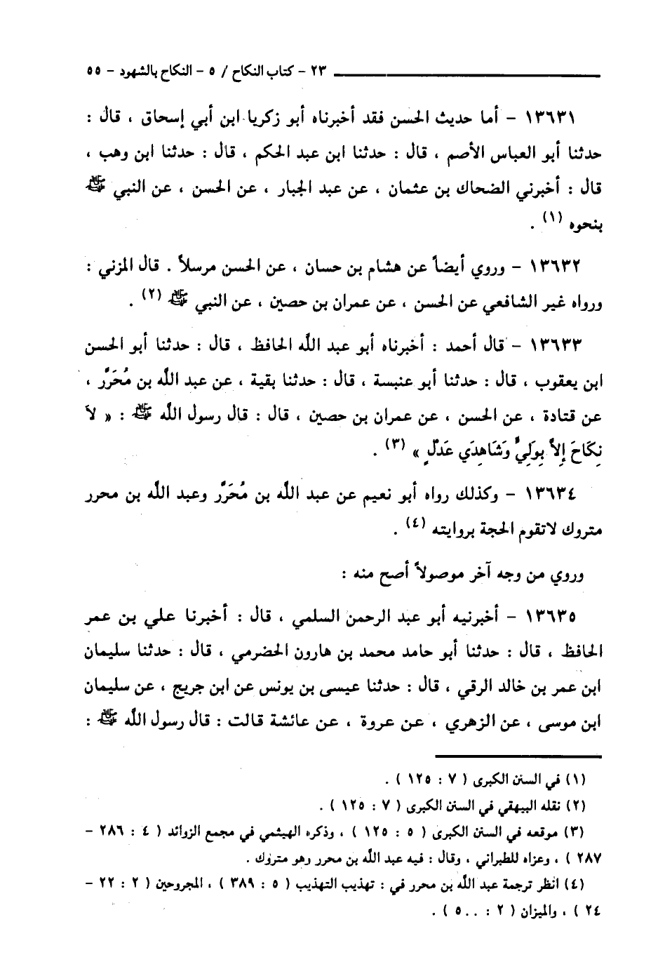 13633 - قَالَ أَحْمَدُ: أَخْبَرَنَاهُ أَبُو عَبْدِ اللَّهِ الْحَافِظُ قَالَ: حَدَّثَنَا أَبُو الْحَسَنِ بْنُ يَعْقُوبَ قَالَ: حَدَّثَنَا أَبُو عَنْبَسَةَ قَالَ: حَدَّثَنَا بَقِيَّةُ، عَنْ عَبْدِ اللَّهِ بْنِ مُحَرَّرٍ، عَنْ قَتَادَةَ، عَنِ الْحَسَنِ، عَنْ عِمْرَانَ بْنِ حُصَيْنٍ قَالَ: قَالَ رَسُولُ اللَّهِ صَلَّى اللهُ عَلَيْهِ وَسَلَّمَ: «§لَا نِكَاحَ إِلَّا بِوَلِيِّ وَشَاهِدَيْ عَدْلٍ»،