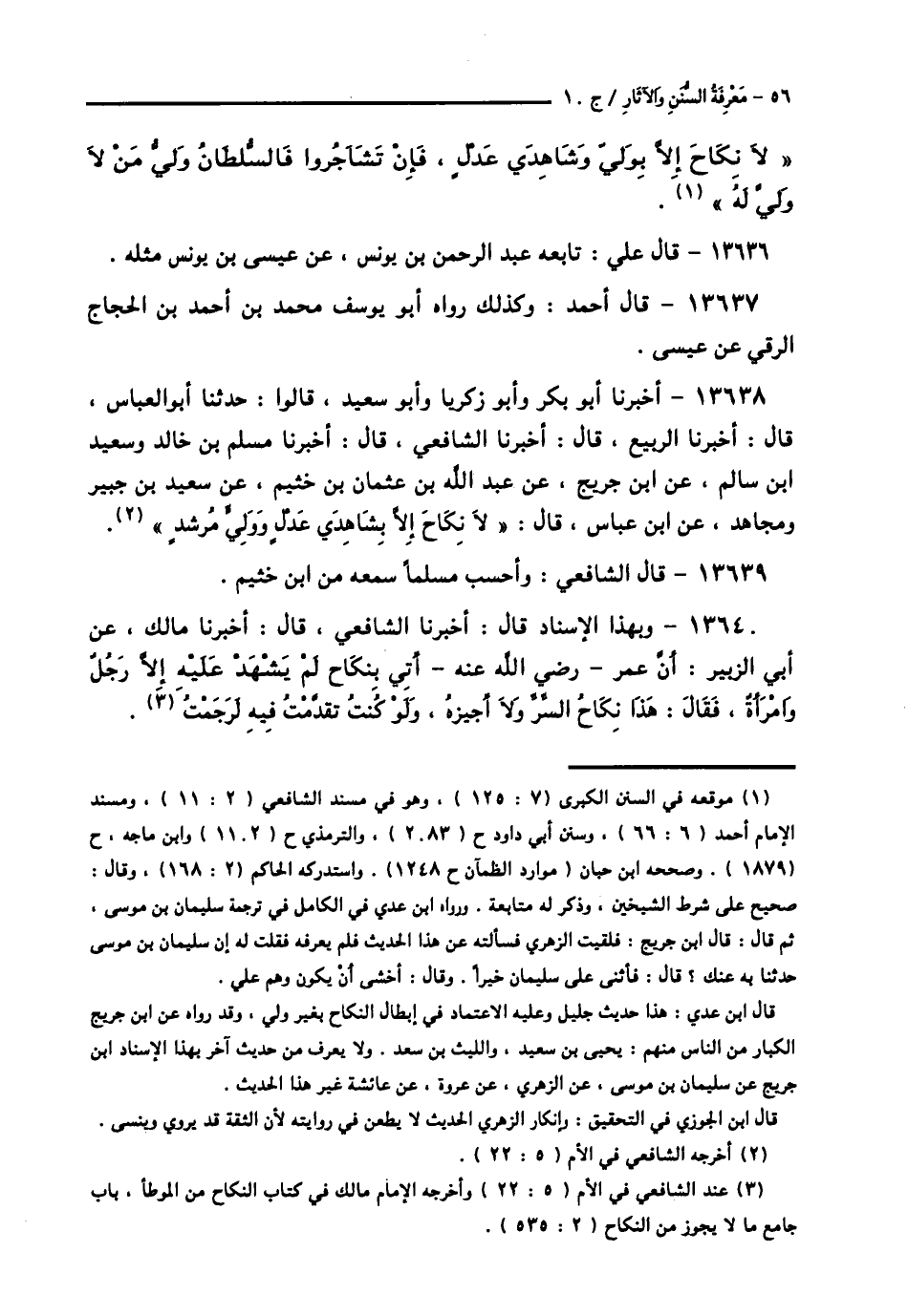 13638 - أَخْبَرَنَا أَبُو بَكْرٍ، وَأَبُو زَكَرِيَّا، وَأَبُو سَعِيدٍ، قَالُوا: حَدَّثَنَا أَبُو الْعَبَّاسِ قَالَ: أَخْبَرَنَا الرَّبِيعُ قَالَ: أَخْبَرَنَا الشَّافِعِيُّ قَالَ: أَخْبَرَنَا مُسْلِمُ بْنُ خَالِدٍ، وَسَعِيدُ بْنُ سَالِمٍ، عَنِ ابْنِ جُرَيْجٍ، عَنْ عَبْدِ اللَّهِ بْنِ عُثْمَانَ بْنِ خُثَيْمٍ، عَنْ سَعِيدِ بْنِ جُبَيْرٍ، وَمُجَاهِدٍ، عَنِ ابْنِ عَبَّاسٍ قَالَ: § «لَا نِكَاحَ إِلَّا بِشَاهِدَيْ عَدْلٍ وَوَلِيٍّ مُرْشِدٍ»
