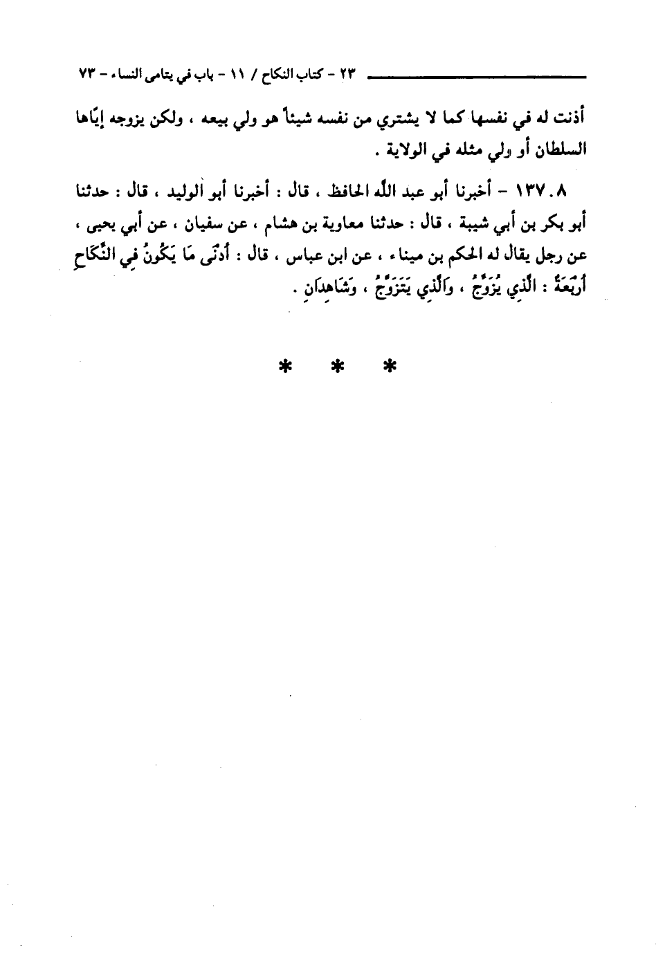 13708 - أَخْبَرَنَا أَبُو عَبْدِ اللَّهِ الْحَافِظُ قَالَ: أَخْبَرَنَا أَبُو الْوَلِيدِ قَالَ: حَدَّثَنَا أَبُو بَكْرِ بْنُ أَبِي شَيْبَةَ قَالَ: حَدَّثَنَا مُعَاوِيَةُ بْنُ هِشَامٍ، عَنْ سُفْيَانَ، عَنْ أَبِي يَحْيَى، عَنْ رَجُلٍ يُقَالُ لَهُ الْحَكَمُ بْنُ مِينَاءَ، عَنِ ابْنِ عَبَّاسٍ قَالَ: " §أَدْنَى مَا يَكُونُ فِي النِّكَاحِ أَرْبَعَةٌ: الَّذِي يُزَوِّجُ، وَالَّذِي يَتَزَوَّجُ، وَشَاهِدَانِ "