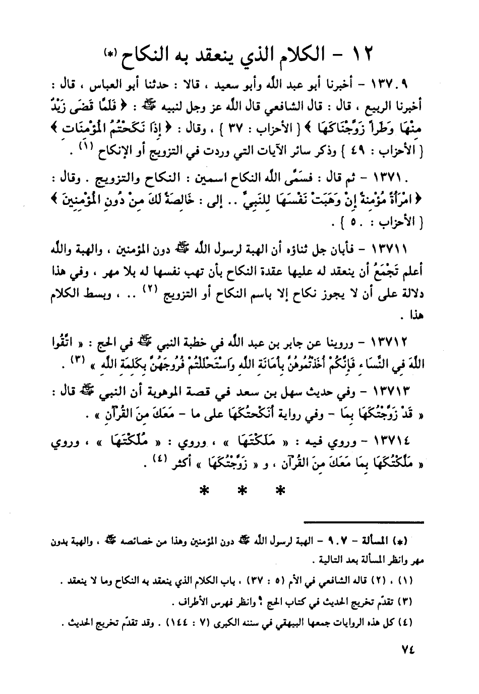 13709 - أَخْبَرَنَا أَبُو عَبْدِ اللَّهِ، وَأَبُو سَعِيدٍ قَالَا: حَدَّثَنَا أَبُو الْعَبَّاسِ قَالَ: أَخْبَرَنَا الرَّبِيعُ، قَالَ: قَالَ الشَّافِعِيُّ: قَالَ اللَّهُ عَزَّ وَجَلَّ لِنَبِيِّهِ صَلَّى اللهُ عَلَيْهِ وَسَلَّمَ: {§فَلَمَّا قَضَى زَيْدٌ مِنْهَا وَطَرًا زَوَّجْنَاكَهَا} [الأحزاب: 37] وَقَالَ: {إِذَا نَكَحْتُمُ الْمُؤْمِنَاتِ} [الأحزاب: 49]، وَذَكَرَ سَائِرَ الْآيَاتِ الَّتِي وَرَدَتْ فِي التَّزْوِيجِ أَوِ الْإِنْكَاحِ،