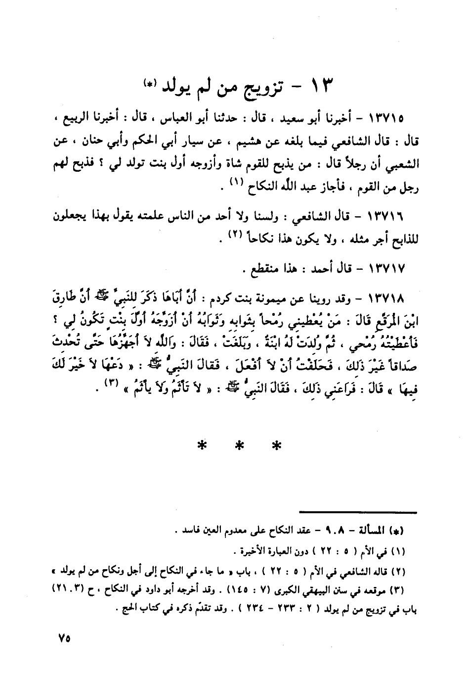 13715 - أَخْبَرَنَا أَبُو سَعِيدٍ قَالَ: حَدَّثَنَا أَبُو الْعَبَّاسِ قَالَ: أَخْبَرَنَا الرَّبِيعُ قَالَ: قَالَ الشَّافِعِيُّ فِيمَا بَلَغَهُ، عَنْ هُشَيْمٍ، عَنْ سَيَّارٍ أَبِي الْحَكَمِ، وَأَبِي حَنَانٍ، عَنِ الشَّعْبِيِّ، " أَنَّ رَجُلًا قَالَ: §مَنْ يَذْبَحُ لِلْقَوْمِ شَاةً وَأُزَوِّجُهُ أَوَّلَ بِنْتٍ تُولَدُ لِي؟ فَذَبَحَ لَهُمْ رَجُلٌ مِنَ الْقَوْمِ، فَأَجَازَ عَبْدُ اللَّهِ النِّكَاحَ "