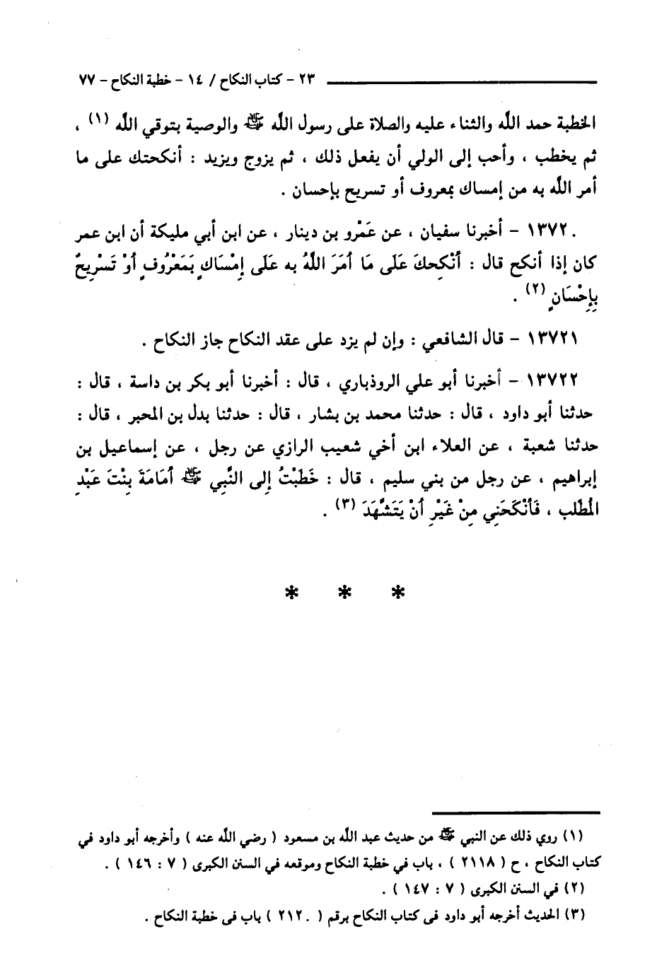 13720 - أَخْبَرَنَا سُفْيَانُ، عَنْ عَمْرِو بْنِ دِينَارٍ، عَنِ ابْنِ أَبِي مُلَيْكَةَ، أَنَّ ابْنَ عُمَرَ كَانَ إِذَا أَنْكَحَ قَالَ: § «أُنْكِحُكَ عَلَى مَا أَمَرَ اللَّهُ بِهِ عَلَى إِمْسَاكٍ بِمَعْرُوفٍ أَوْ تَسْرِيحٍ بِإِحْسَانٍ»