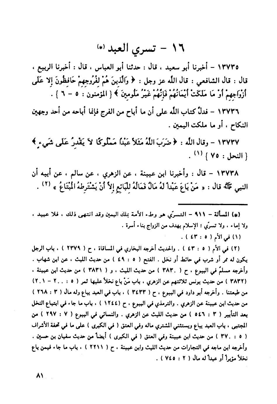 13735 - أَخْبَرَنَا أَبُو سَعِيدٍ قَالَ: حَدَّثَنَا أَبُو الْعَبَّاسِ قَالَ: أَخْبَرَنَا الرَّبِيعُ قَالَ: قَالَ الشَّافِعِيُّ: قَالَ اللَّهُ عَزَّ وَجَلَّ: {§وَالَّذِينَ هُمْ لِفُرُوجِهِمْ حَافِظُونَ إِلَّا عَلَى أَزْوَاجِهِمْ أَوْ مَا مَلَكَتِ أَيْمَانُهُمْ فَإِنَّهُمْ غَيْرُ مَلُومِينَ} [المؤمنون: 6]،