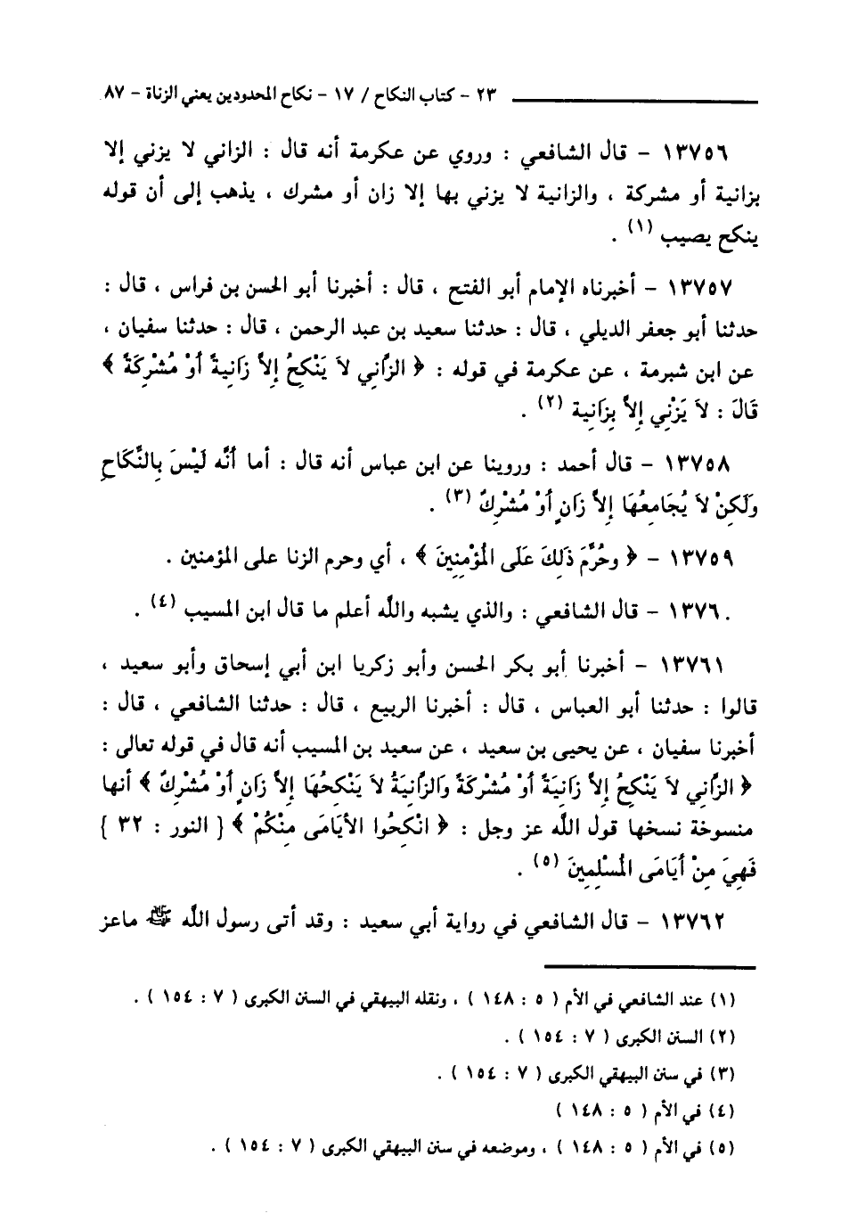 13761 - أَخْبَرَنَا أَبُو بَكْرٍ الْحَسَنُ، وَأَبُو زَكَرِيَّا بْنُ أَبِي إِسْحَاقَ، وَأَبُو سَعِيدٍ، قَالُوا: حَدَّثَنَا أَبُو الْعَبَّاسِ قَالَ: أَخْبَرَنَا الرَّبِيعُ قَالَ: حَدَّثَنَا الشَّافِعِيُّ قَالَ: أَخْبَرَنَا سُفْيَانُ، عَنْ يَحْيَى بْنِ سَعِيدٍ، عَنْ سَعِيدِ بْنِ الْمُسَيِّبِ، أَنَّهُ قَالَ فِي قَوْلِهِ تَعَالَى: {§الزَّانِي لَا يَنْكِحُ إِلَّا زَانِيَةً أَوْ مُشْرِكَةً وَالزَّانِيَةُ لَا يَنْكِحُهَا إِلَّا زَانٍ أَوْ مُشْرِكٌ} [النور: 3] " أَنَّهَا مَنْسُوخَةٌ، نَسَخَهَا قَوْلُ اللَّهِ عَزَّ وَجَلَّ: {وَأَنْكِحُوا الْأَيَامَى} [النور: 32] مِنْكُمْ، فَهِيَ مِنْ أَيَامَى الْمُسْلِمِينَ "
