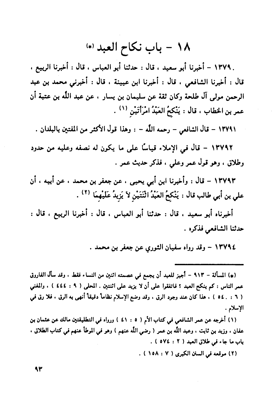 13790 - أَخْبَرَنَا أَبُو سَعِيدٍ قَالَ: حَدَّثَنَا أَبُو الْعَبَّاسِ قَالَ: أَخْبَرَنَا الرَّبِيعُ قَالَ: أَخْبَرَنَا الشَّافِعِيُّ قَالَ: أَخْبَرَنَا ابْنُ عُيَيْنَةَ قَالَ: أَخْبَرَنِي مُحَمَّدُ بْنُ عَبْدِ الرَّحْمَنِ، مَوْلَى آلِ طَلْحَةَ وَكَانَ ثِقَةً، عَنْ سُلَيْمَانَ بْنِ يَسَارٍ، عَنْ عَبْدِ اللَّهِ بْنِ عُتْبَةَ، أَنَّ عُمَرَ بْنَ الْخَطَّابِ قَالَ: «§يَنْكِحُ الْعَبْدُ امْرَأَتَيْنِ»