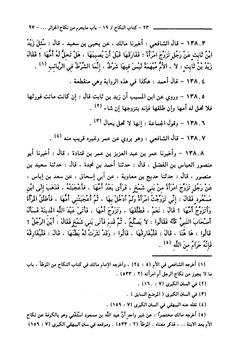 13803 - قَالَ الشَّافِعِيُّ: أَخْبَرَنَا مَالِكٌ، عَنْ يَحْيَى بْنِ سَعِيدٍ قَالَ: سُئِلَ زَيْدُ بْنُ ثَابِتٍ عَنْ رَجُلٍ تَزَوَّجَ امْرَأَةً فَفَارَقَهَا قَبْلَ أَنْ يُصِيبَهَا، هَلْ تَحِلُّ لَهُ أُمُّهَا؟ فَقَالَ زَيْدُ بْنُ ثَابِتٍ: «لَا، §الْأُمُّ مُبْهَمَةٌ لَيْسَ فِيهَا شَرْطٌ، إِنَّمَا الشَّرْطُ فِي الرَّبَائِبِ»