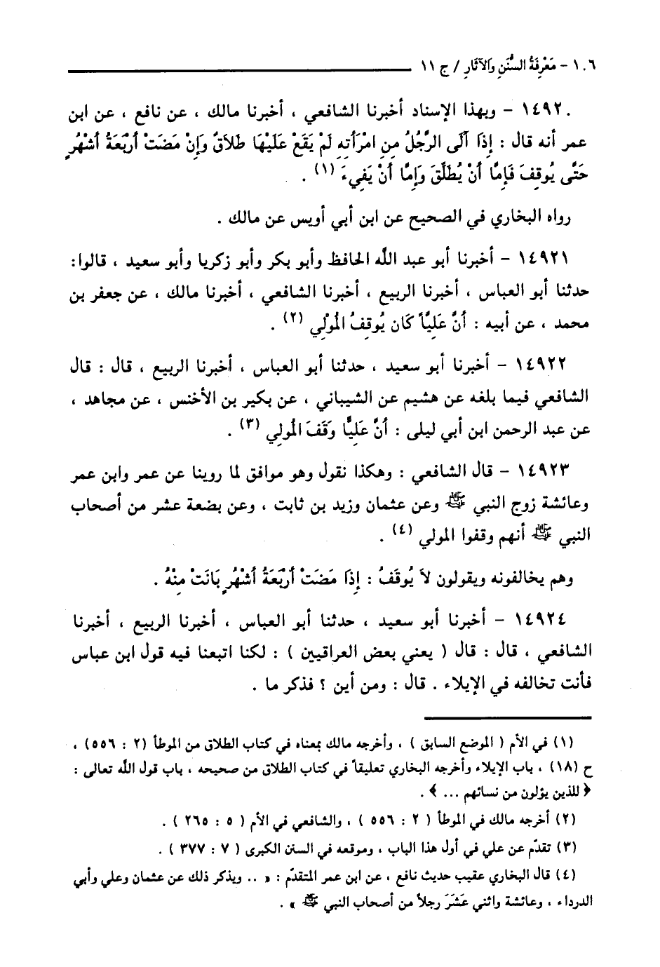 14923 - قَالَ الشَّافِعِيُّ: وَهَكَذَا نَقُولُ وَهُوَ مُوافِقٌ لِمَا رُوِّينَا عَنْ عُمَرَ، وَابْنِ عُمَرَ، وَعَائِشَةَ زَوْجِ النَّبِيِّ صَلَّى اللهُ عَلَيْهِ وَسَلَّمَ، وَعَنْ عُثْمَانَ، وَزَيْدِ بْنِ ثَابِتٍ، وَعَنْ بِضْعَةَ عَشَرَ مِنْ أَصْحَابِ النَّبِيِّ صَلَّى اللهُ عَلَيْهِ وَسَلَّمَ أَنَّهُمْ وَقَفُوا الْمُولِي. وَهُمْ يُخَالِفُونَهُ وَيَقُولُونَ لَا يُوقَفُ، إِذَا مَضَتْ أَرْبَعَةُ أَشْهُرٍ بَانَتْ مِنْهُ.