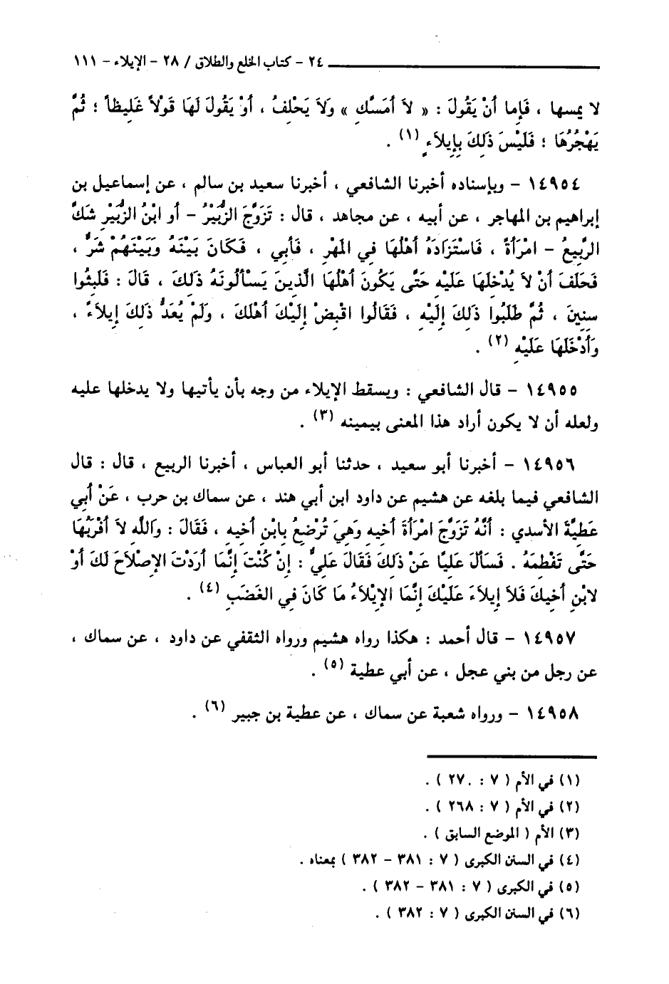 14954 - وَبِإِسْنَادِهِ أَخْبَرَنَا الشَّافِعِيُّ، أَخْبَرَنَا سَعِيدُ بْنُ سَالِمٍ، عَنْ إِسْمَاعِيلَ بْنِ إِبْرَاهِيمَ بْنِ الْمُهَاجِرِ، عَنْ أَبِيهِ، عَنْ مُجَاهِدٍ قَالَ: " §تَزَوَّجَ الزُّبَيْرُ أَوِ ابْنُ الزُّبَيْرِ، شَكَّ الرَّبِيعُ، امْرَأَةً فَاسْتَزَادَهُ أَهْلُهَا فِي الْمَهْرِ فَأَبَى، فَكَانَ بَيْنَهُ وَبَيْنَهُمْ شَرٌّ، فَحَلَفَ أَنْ لَا يُدْخِلَهَا عَلَيْهِ حَتَّى يَكُونَ أَهْلُهَا الَّذِينَ يَسْأَلُونَهُ ذَلِكَ قَالَ: فَلَبِثُوا سِنِينَ، ثُمَّ طَلَبُوا ذَلِكَ إِلَيْهِ فَقَالُوا: اقْبِضْ إِلَيْكَ أَهْلَكَ، وَلَمْ يُعَدَّ ذَلِكَ إِيلَاءٌ، وَأَدْخَلَهَا عَلَيْهِ ".