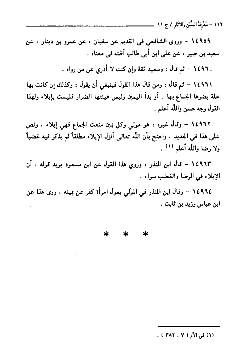 14963 - قَالَ ابْنُ الْمُنْذِرِ: وَرُوِيَ هَذَا الْقَوْلُ، عَنِ ابْنِ مَسْعُودٍ، يُرِيدُ قَولَهُ: «أَنَّ §الْإِيلَاءَ فِي الرِّضَا وَالْغَضَبِ سَوَاءً».