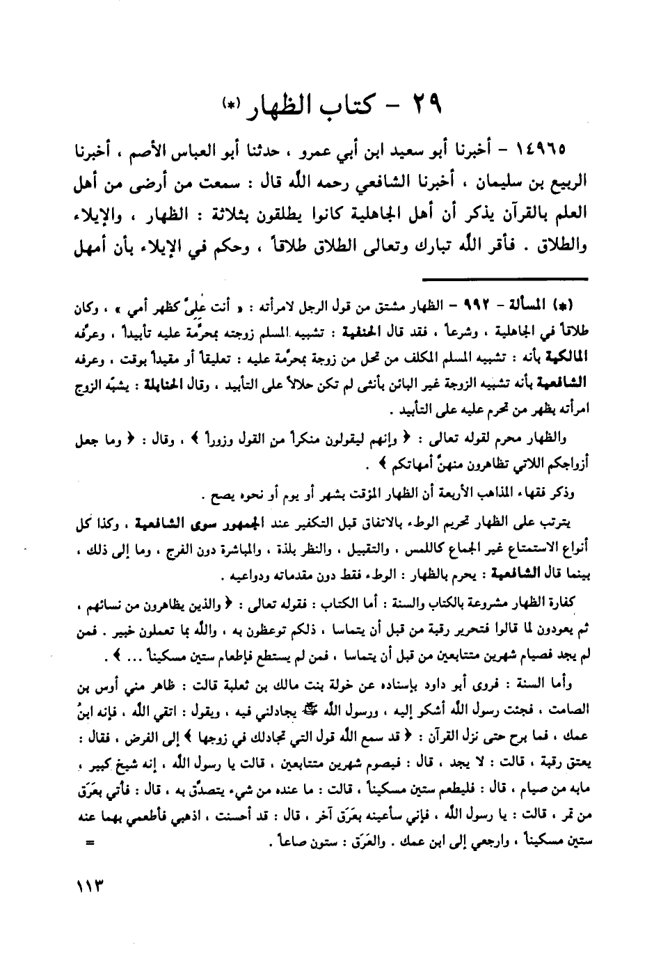 14965 - أَخْبَرَنَا أَبُو سَعِيدِ بْنُ أَبِي عَمْرٍو، حَدَّثَنَا أَبُو الْعَبَّاسِ الْأَصَمُّ، أَخْبَرَنَا الرَّبِيعُ بْنُ سُلَيْمَانَ، أَخْبَرَنَا الشَّافِعِيُّ رَحِمَهُ اللَّهُ قَالَ: §" سَمِعْتُ مَنْ أَرْضَى مِنْ أَهْلِ الْعِلْمِ بِالْقُرْآنِ يَذْكُرُ أَنَّ أَهْلَ الْجَاهِلِيَّةِ كَانُوا يُطَلِّقُونَ بِثَلَاثَةٍ: الظِّهَارِ، وَالْإِيلَاءِ، وَالطَّلَاقِ. فَأَقَرَّ اللَّهُ تَبَارَكَ وَتَعَالَى الطَّلَاقَ طَلَاقًا، وَحَكَمَ فِي الْإِيلَاءِ بِأَنْ أَمْهَلَ -[114]- الْمُولِي أَرْبَعَةَ أَشْهُرٍ، ثُمَّ جَعَلَ عَلَيْهِ أَنْ يَفِيءَ أَوْ يُطَلِّقَ، وَحَكَمَ فِي الظِّهَارِ بِالْكَفَّارَةِ، فَإِذَا تَظَاهَرَ الرَّجُلُ مِنَ امْرَأَتِهِ يُرِيدُ طَلَاقَهَا أَوْ يُرِيدُ تَحْرِيمَهَا بِلَا طَلَاقٍ فَلَا يَقَعُ بِهِ طَلَاقٌ بِحَالٍ وَهُوَ مُتَظَاهِرٌ، وَكَذَلِكَ إِنْ تَكَلَّمَ بِالظِّهَارِ وَلَمْ يَنْوِ شَيْئًا فَهُوَ مُتَظَاهِرٌ، قَالَ اللَّهُ تَبَارَكَ وَتَعَالَى: {وَالَّذِينَ يُظَاهِرُونَ مِنْ نِسَائِهِمْ ثُمَّ يَعُودُونَ لِمَا قَالُوا فَتَحْرِيرُ رَقَبَةٍ} [المجادلة: 3].