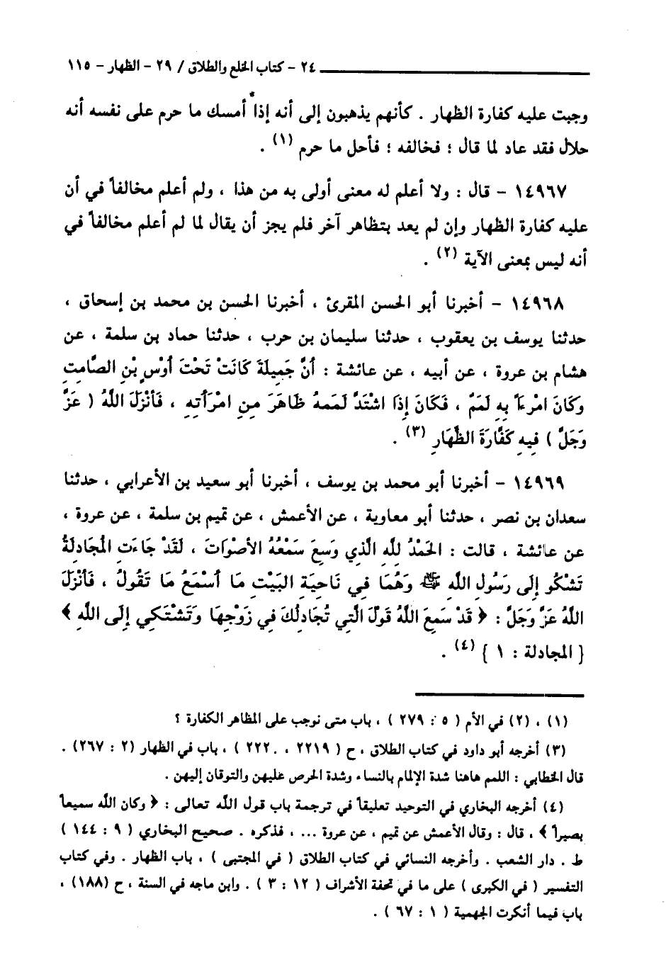 14968 - أَخْبَرَنَا أَبُو الْحَسَنِ الْمُقْرِئُ، أَخْبَرَنَا الْحَسَنُ بْنُ مُحَمَّدِ بْنِ إِسْحَاقَ، حَدَّثَنَا يُوسُفُ بْنُ يَعْقُوبَ، حَدَّثَنَا سُلَيْمَانُ بْنُ حَرْبٍ، حَدَّثَنَا حَمَّادُ بْنُ سَلَمَةَ، عَنْ هِشَامِ بْنِ عُرْوَةَ، عَنْ أَبِيهِ، عَنْ عَائِشَةَ، أَنَّ جَمِيلَةَ، كَانَتْ تَحْتَ أَوْسِ بْنِ الصَّامِتِ وَكَانَ امْرَأً بِهِ لَمَمٌ، فَكَانَ إِذَا اشْتَدَّ لَمَمُهُ ظَاهَرَ مِنَ امْرَأَتِهِ، فَأَنْزَلَ اللَّهُ عَزَّ وَجَلَّ فِيهِ كَفَّارَةُ الظِّهَارِ.