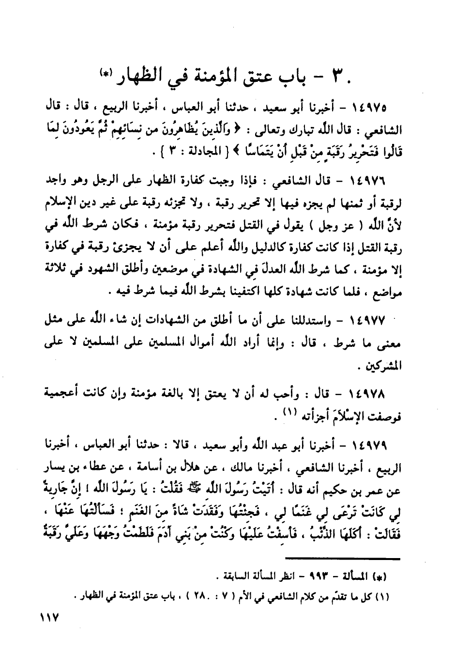 14976 - قَالَ الشَّافِعِيُّ: فَإِذَا وَجَبَتْ كَفَّارَةُ الظِّهَارِ عَلَى الرَّجُلِ وَهُوَ وَاجِدٌ لِرَقَبَةٍ أَوْ ثَمَنِهَا لَمْ يُجْزِهِ فِيهَا إِلَّا تَحْرِيرُ رَقَبَةٍ، وَلَا تُجْزِئُهُ رَقَبَةٌ عَلَى غَيْرِ دِينِ الْإِسْلَامِ لِأَنَّ اللَّهَ عَزَّ وَجَلَّ يَقُولُ فِي الْقَتْلِ {فَتَحْرِيرُ رَقَبَةٍ مُؤْمِنَةٍ} [النساء: 92] فَكَانَ شَرْطُ اللَّهِ فِي رَقَبَةِ الْقَتْلِ إِذَا كَانَتْ كَفَّارَةً كَالدَّلِيلِ وَاللَّهُ أَعْلَمُ عَلَى أَنْ لَا يُجْزِئَ رَقَبَةٌ فِي كَفَّارَةٍ إِلَّا مُؤْمِنَةً، كَمَا شَرَطَ اللَّهُ الْعَدْلَ فِي الشَّهَادَةِ فِي مَوضِعَيْنِ وَأَطْلَقَ الشُّهُودَ فِي ثَلَاثَةِ مَوَاضِعَ، فَلَمَّا كَانَتْ شَهَادَةٌ كُلُّهَا اكْتَفَيْنَا بِشَرْطِ اللَّهِ فِيمَا شَرَطَ فِيهِ.