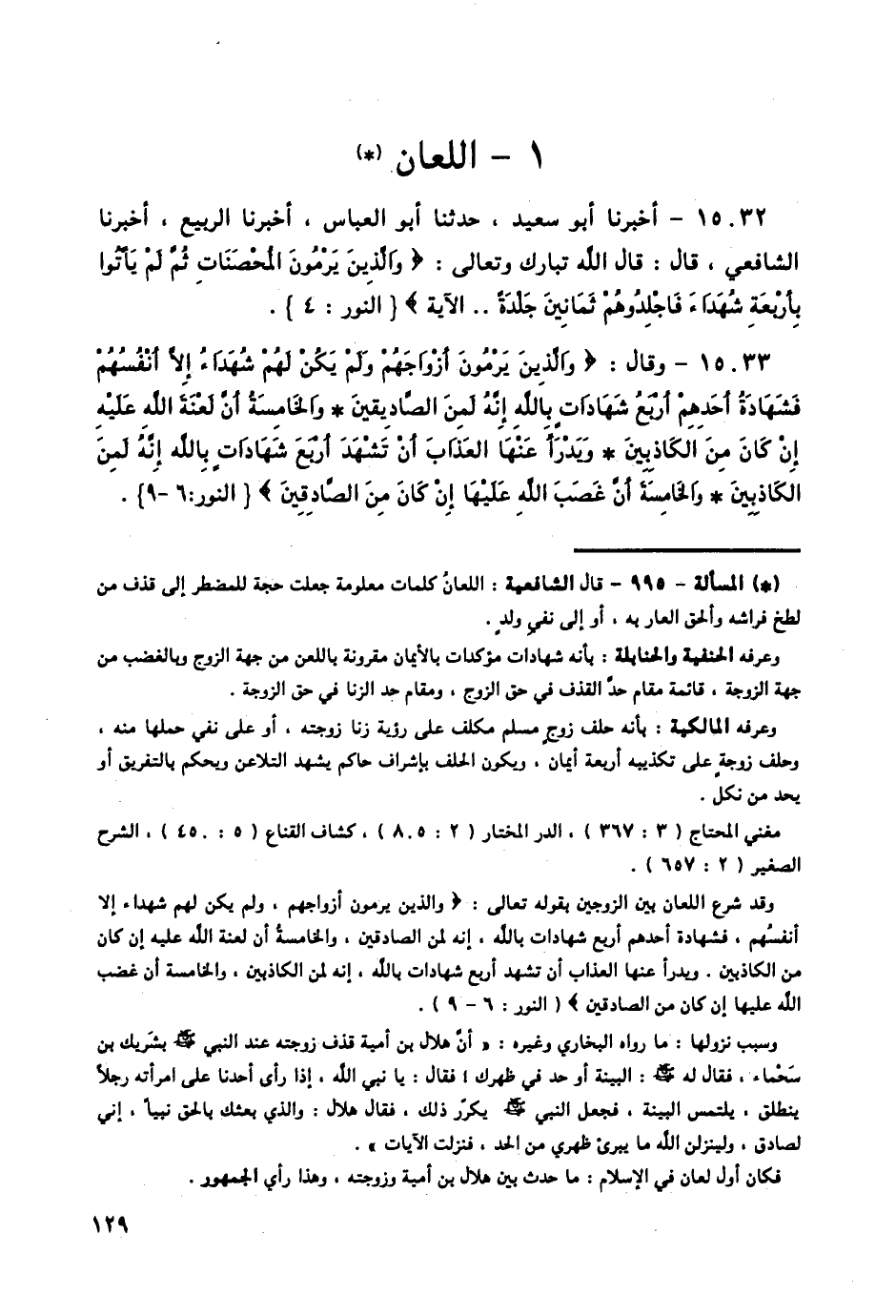15033 - وَقَالَ: {وَالَّذِينَ يَرْمُونَ أَزْوَاجَهُمْ وَلَمْ يَكُنْ لَهُمْ شُهَدَاءُ إِلَّا أَنْفُسُهُمْ فَشَهَادَةُ أَحَدِهِمْ أَرْبَعُ شَهَادَاتٍ بِاللَّهِ إِنَّهُ لَمِنَ الصَّادِقِينَ، وَالْخَامِسَةُ أَنَّ لَعْنَةَ اللَّهِ عَلَيْهِ إِنْ كَانَ مِنَ الْكَاذِبِينَ، وَيَدْرَأُ عَنْهَا الْعَذَابَ أَنْ تَشْهَدَ أَرْبَعَ شَهَادَاتٍ بِاللَّهِ إِنَّهُ لَمِنَ الْكَاذِبِينَ، وَالْخَامِسَةَ أَنَّ غَضَبَ اللَّهِ عَلَيْهَا إِنْ كَانَ مِنَ الصَّادِقِينَ} -[130]-.