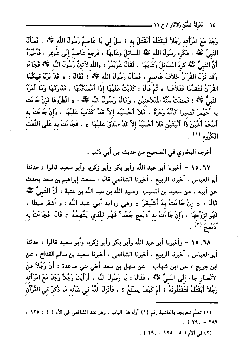 15068 - وَأَخْبَرَنَا أَبُو عَبْدِ اللَّهِ، وَأَبُو بَكْرٍ، وَأَبُو زَكَرِيَّا، وَأَبُو سَعِيدٍ، قَالُوا: حَدَّثَنَا أَبُو الْعَبَّاسِ، أَخْبَرَنَا الرَّبِيعُ، أَخْبَرَنَا الشَّافِعِيُّ، أَخْبَرَنَا سَعِيدُ بْنُ سَالِمٍ الْقَدَّاحُ، عَنِ ابْنِ جُرَيْجٍ، عَنِ ابْنِ شِهَابٍ، عَنْ سَهْلِ بْنِ سَعْدٍ أَخِي بَنِي سَاعِدَةَ أَنَّ رَجُلًا مِنَ الْأَنْصَارِ جَاءَ إِلَى النَّبِيِّ صَلَّى اللهُ عَلَيْهِ وَسَلَّمَ فَقَالَ: يَا رَسُولَ اللَّهِ أَرَأَيْتَ رَجُلًا وَجَدَ مَعَ امْرَأَتِهِ رَجُلًا أَيَقْتُلُهُ فَتَقْتُلُونَهُ؟ أَمْ كَيْفَ يَصْنَعُ؟ فَأَنْزَلَ اللَّهُ فِي شَأْنِهِ مَا ذُكِرَ فِي الْقُرْآنِ -[141]- فِي أَمْرِ الْمُتَلَاعِنَيْنِ قَالَ: فَقَالَ النَّبِيُّ صَلَّى اللهُ عَلَيْهِ وَسَلَّمَ: «§قَدْ قُضِيَ فِيكَ وَفِي امْرَأَتِكَ» قَالَ: فَتَلَاعَنَا وَأَنَا شَاهِدٌ، ثُمَّ فَارَقَهَا عِنْدَ النَّبِيِّ صَلَّى اللهُ عَلَيْهِ وَسَلَّمَ، فَكَانَتِ السُّنَّةُ بَعْدَهُمَا أَنْ يُفَرَّقَ بَيْنَ الْمُتَلَاعِنَيْنِ، وَكَانَتْ حَامِلًا فَأَنْكَرَهُ فَكَانَ ابْنُهَا يُدْعَى إِلَى أُمِّهِ. أَخْرَجَاهُ فِي الصَّحِيحِ، مِنْ حَدِيثِ ابْنِ جُرَيْجٍ أَتَمَّ مِنْ هَذَا