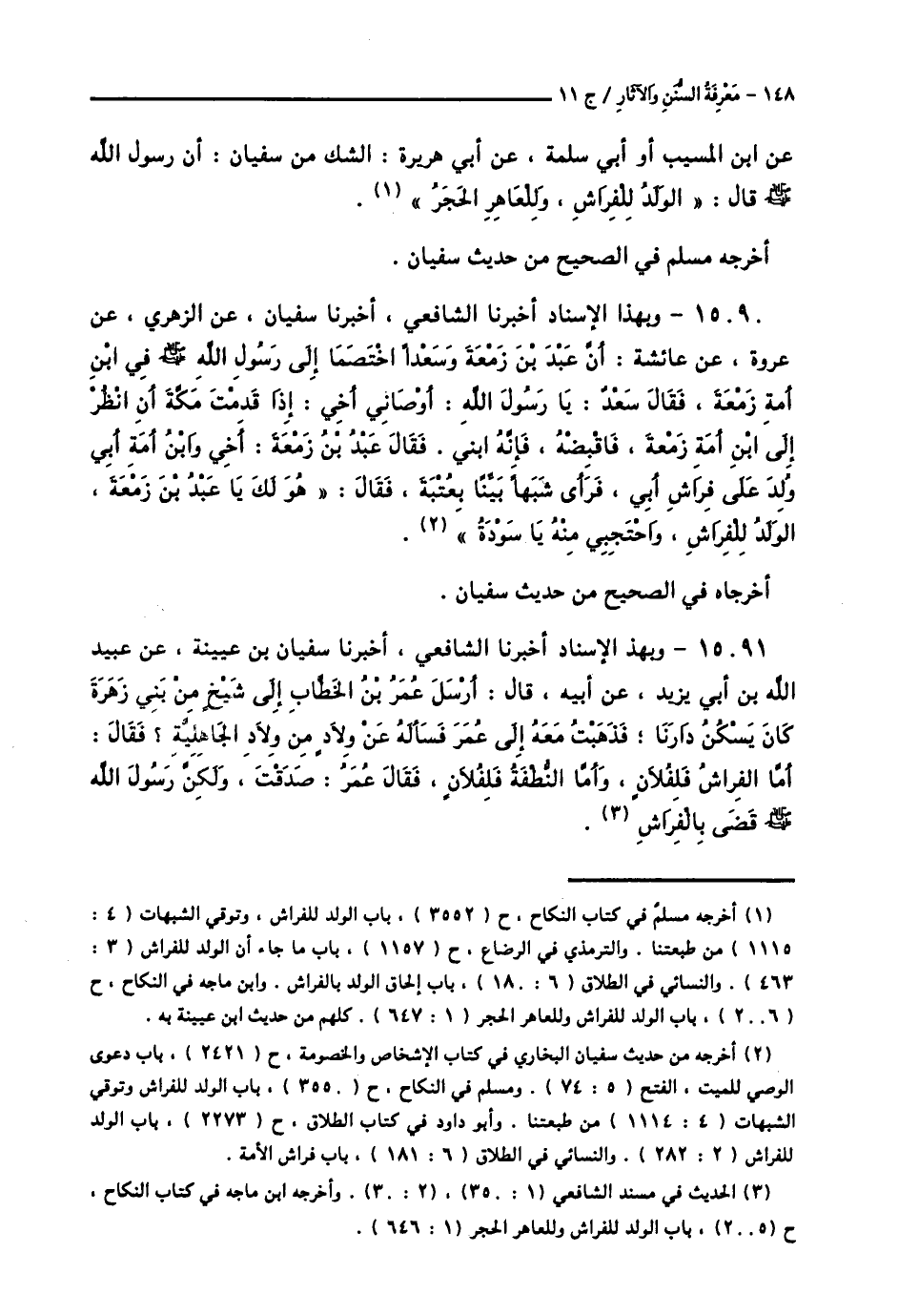 15091 - وَبِهَذَا الْإِسْنَادِ أَخْبَرَنَا الشَّافِعِيُّ، أَخْبَرَنَا سُفْيَانُ بْنُ عُيَيْنَةَ، عَنْ عُبَيْدِ اللَّهِ بْنِ أَبِي يَزِيدَ، عَنْ أَبِيهِ قَالَ: أَرْسَلَ عُمَرُ بْنُ الْخَطَّابِ إِلَى شَيْخٍ مِنْ بَنِي زُهْرَةَ كَانَ يَسْكُنُ دَارَنَا، فَذَهَبْتُ مَعَهُ إِلَى عُمَرَ فَسَأَلَهُ عَنْ وِلَادٍ مِنْ وِلَادِ الْجَاهِلِيَّةِ؟ فَقَالَ: أَمَّا الْفِرَاشُ فَلِفُلَانٍ، وَأَمَّا النُّطْفَةُ فَلِفُلَانٍ، فَقَالَ عُمَرُ: صَدَقْتَ، وَلَكِنَّ رَسُولَ اللَّهِ صَلَّى اللهُ عَلَيْهِ وَسَلَّمَ قَضَى بِالْفِرَاشِ -[149]-.