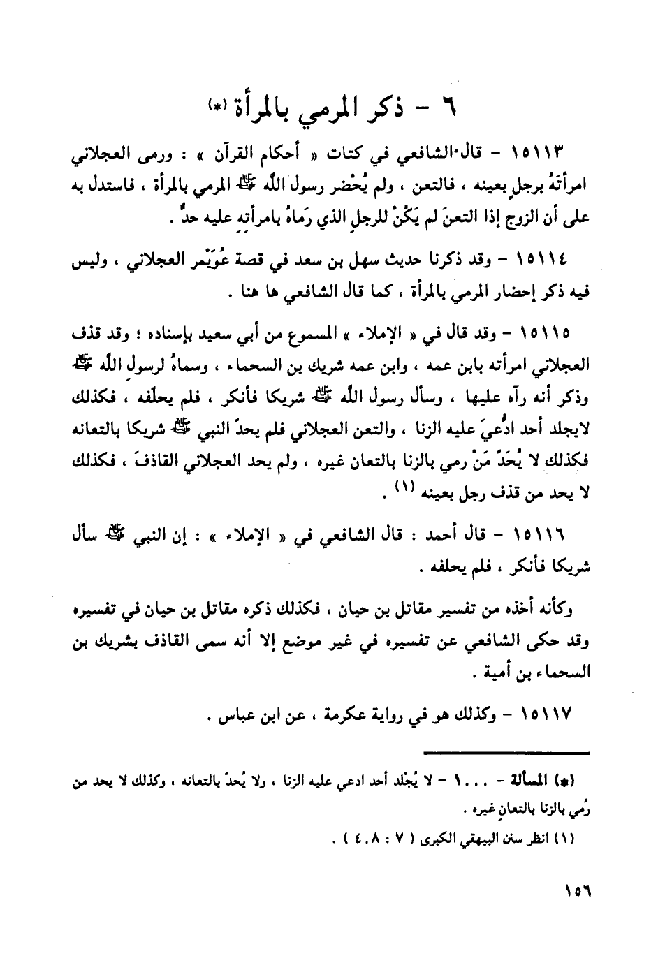15116 - قَالَ أَحْمَدُ: قَالَ الشَّافِعِيُّ فِي الْإِمْلَاءِ: إِنَّ النَّبِيَّ صَلَّى اللهُ عَلَيْهِ وَسَلَّمَ سَأَلَ شَرِيكًا فَأَنْكَرَ، فَلَمْ يُحَلِّفْهُ، وَكَأَنَّهُ أَخَذَهُ مِنْ تَفْسِيرِ مُقَاتِلِ بْنِ حَيَّانَ، فَكَذَلِكَ ذَكَرَهُ مُقَاتِلُ بْنُ حَيَّانَ فِي تَفْسِيرِهِ، وَقَدْ حَكَى الشَّافِعِيُّ عَنْ تَفْسِيرِهِ فِي غَيْرِ مَوْضِعٍ إِلَّا أَنَّهُ سَمَّى الْقَاذِفَ بِشَرِيكِ بْنِ السَّحْمَاءِ بْنِ أُمَيَّةَ.