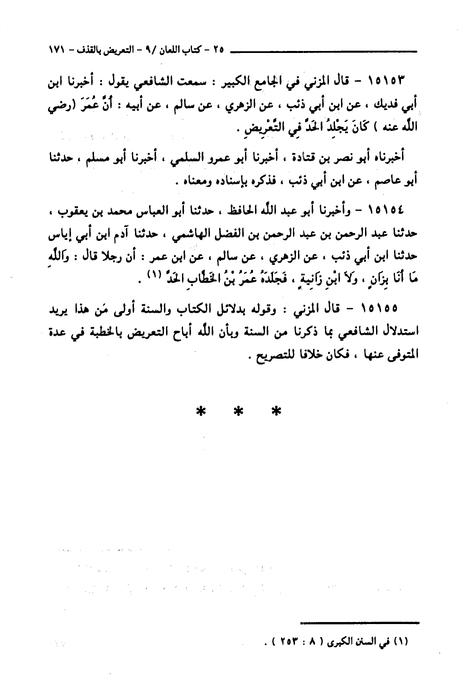 15154 - وَأَخْبَرَنَا أَبُو عَبْدِ اللَّهِ الْحَافِظُ، حَدَّثَنَا أَبُو الْعَبَّاسِ مُحَمَّدُ بْنُ يَعْقُوبَ، حَدَّثَنَا عَبْدُ الرَّحْمَنِ بْنُ عَبْدِ الرَّحْمَنِ بْنِ الْفَضْلِ الْهَاشِمِيُّ، حَدَّثَنَا آدَمُ بْنُ أَبِي إِيَاسٍ، حَدَّثَنَا ابْنُ أَبِي ذِئْبٍ، عَنِ الزُّهْرِيِّ، عَنْ سَالِمٍ، عَنِ ابْنِ عُمَرَ، «أَنَّ» §رَجُلًا قَالَ وَاللَّهِ مَا أَنَا بِزَانٍ وَلَا ابْنِ زَانِيَةٍ، فَجَلَدَهُ عُمَرُ بْنُ الْخَطَّابِ الْحَدَّ "