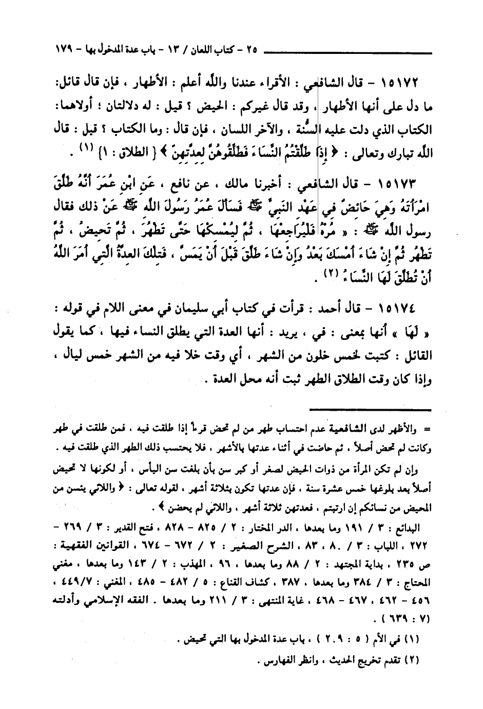 15173 - قَالَ الشَّافِعِيُّ: أَخْبَرَنَا مَالِكٌ، عَنْ نَافِعٍ، عَنِ ابْنِ عُمَرَ، أَنَّهِ طَلَّقَ امْرَأَتَهُ وَهِيَ حَائِضٌ فِي عَهْدِ النَّبِيِّ صَلَّى اللهُ عَلَيْهِ وَسَلَّمَ فَسَأَلَ عُمَرُ رَسُولَ اللَّهِ صَلَّى اللهُ عَلَيْهِ وَسَلَّمَ عَنْ ذَلِكَ، فَقَالَ رَسُولُ اللَّهِ صَلَّى اللهُ عَلَيْهِ وَسَلَّمَ: «§مُرْهُ فَلْيُرَاجِعْهَا، ثُمَّ لِيُمْسِكْهَا حَتَّى تَطْهُرَ، ثُمَّ تَحِيضَ، ثُمَّ تَطْهُرَ ثُمَّ إِنْ شَاءَ أَمْسَكَ بَعْدُ وَإِنْ شَاءَ طَلَّقَ قَبْلَ أَنْ يَمَسَّ، فَتِلْكَ الْعِدَّةُ الَّتِي أَمَرَ اللَّهُ أَنْ تُطَلَّقَ لَهَا النِّسَاءُ».