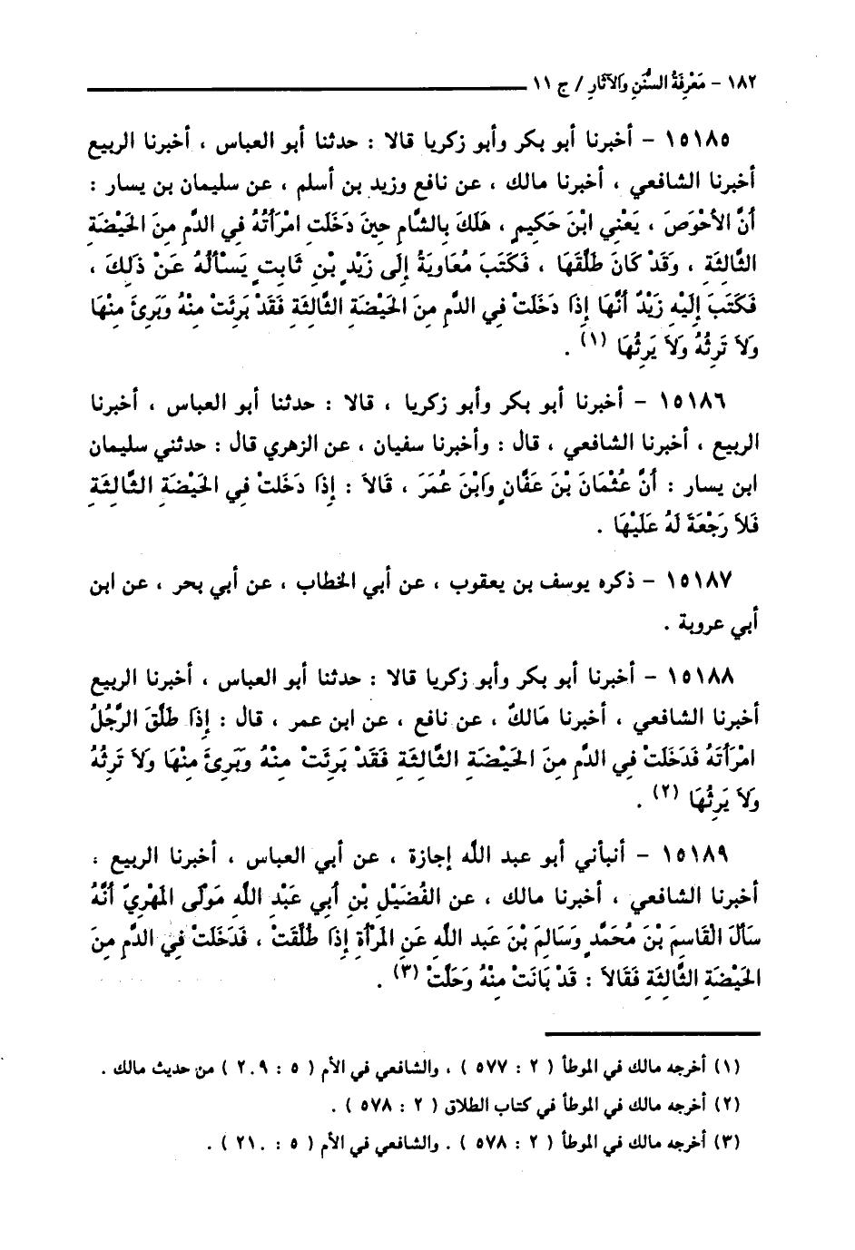 15189 - أَنْبَأَنِي أَبُو عَبْدِ اللَّهِ إِجَازَةً، عَنْ أَبِي الْعَبَّاسِ، أَخْبَرَنَا الرَّبِيعُ، أَخْبَرَنَا الشَّافِعِيُّ، أَخْبَرَنَا مَالِكٌ، عَنِ الْفُضَيْلِ بْنِ أَبِي عَبْدِ اللَّهِ مَوْلَى الْمَهْرِيِّ، أَنَّهُ سَأَلَ الْقَاسِمَ بْنَ مُحَمَّدٍ، وَسَالِمَ بْنَ عَبْدِ اللَّهِ عَنِ الْمَرْأَةِ إِذَا طُلِّقَتْ فَدَخَلَتْ فِي الدَّمِ مِنَ الْحَيْضَةِ الثَّالِثَةِ فَقَالَا: § «قَدْ بَانَتْ مِنْهُ وَحَلَّتْ»
