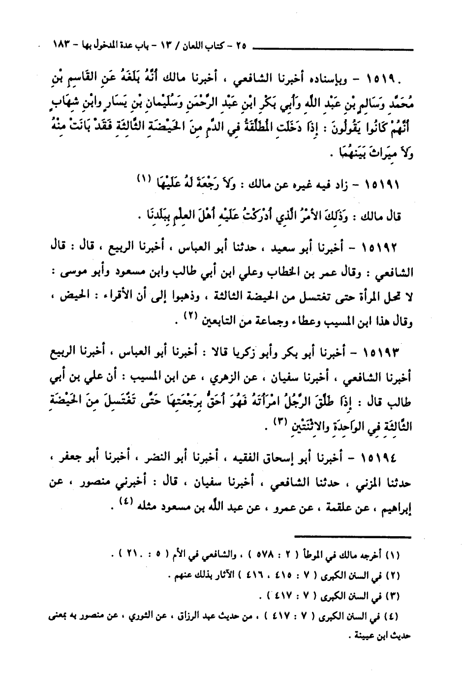 15190 - وَبِإِسْنَادِهِ أَخْبَرَنَا الشَّافِعِيُّ، أَخْبَرَنَا مَالِكٌ، أَنَّهُ بَلَغَهُ، عَنِ الْقَاسِمِ بْنِ مُحَمَّدٍ، وَسَالِمِ بْنِ عَبْدِ اللَّهِ، وَأَبِي بَكْرِ بْنِ عَبْدِ الرَّحْمَنِ، وَسُلَيْمَانَ بْنِ يَسَارٍ، وَابْنِ شِهَابٍ، أَنَّهُمْ كَانُوا يَقُولُونَ: § «إِذَا دَخَلَتِ الْمُطَلَّقَةُ فِي الدَّمِ مِنَ الْحَيْضَةِ الثَّالِثَةِ فَقَدْ بَانَتْ مِنْهُ، وَلَا مِيرَاثَ بَيْنَهُمَا»
