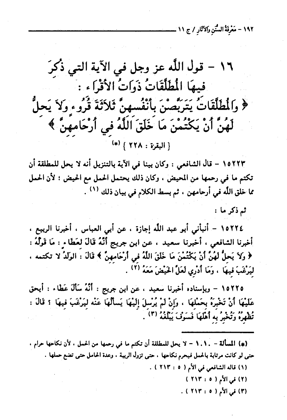 15223 - قَالَ الشَّافِعِيُّ: وَكَانَ بَيِّنًا فِي الْآيَةِ بِالتَّنْزِيلِ أَنَّهُ «لَا يَحِلُّ لِلْمُطَلَّقَةِ أَنْ تَكْتُمَ مَا فِي رَحِمِهَا مِنَ الْمَحِيضِ، وَكَانَ ذَلِكَ يَحْتَمِلُ الْحَمْلَ مَعَ الْحَيْضِ؛ لِأَنَّ الْحَمْلَ مِمَّا خَلَقَ اللَّهُ فِي أَرْحَامِهِنَّ»، ثُمَّ بَسَطَ الْكَلَامَ فِي بَيَانِ ذَلِكَ، ثُمَّ ذَكَرَ مَا