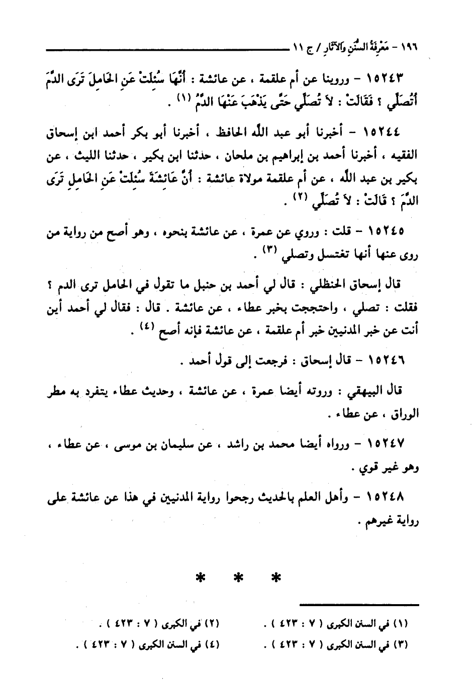 15243 - وَرُوِّينَا عَنْ أُمِّ عَلْقَمَةَ، عَنْ عَائِشَةَ، أَنَّهَا سُئِلَتْ عَنِ الْحَامِلِ تَرَى الدَّمَ أَتُصَلِّي؟ فَقَالَتْ: § «لَا تُصَلِّي حَتَّى يَذْهَبَ عَنْهَا الدَّمُ»