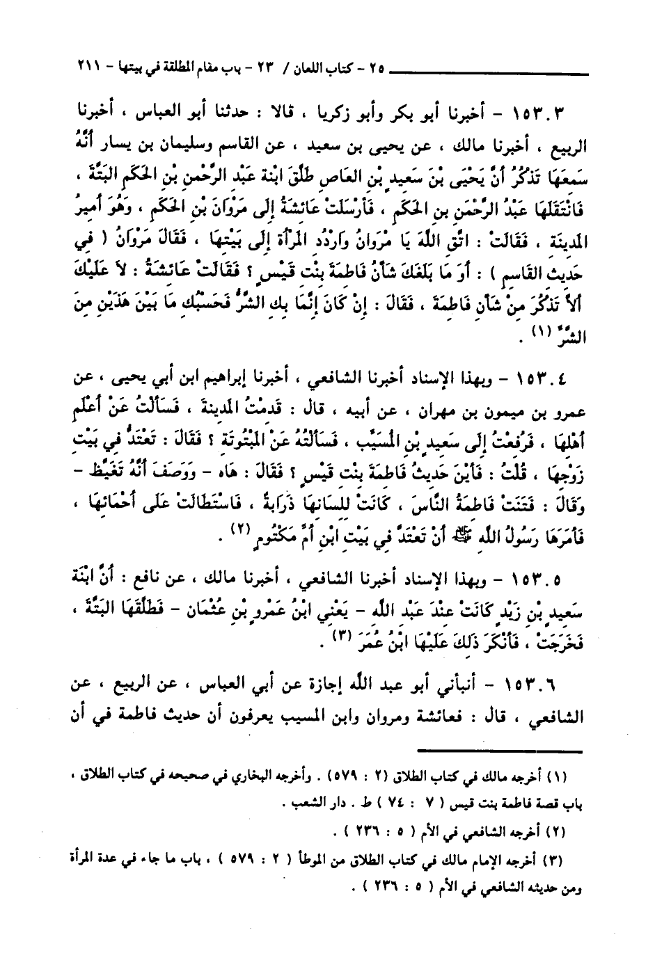 15303 - أَخْبَرَنَا أَبُو بَكْرٍ، وَأَبُو زَكَرِيَّا قَالَا: حَدَّثَنَا أَبُو الْعَبَّاسِ، أَخْبَرَنَا الرَّبِيعُ، أَخْبَرَنَا مَالِكٌ، عَنْ يَحْيَى بْنِ سَعِيدٍ، عَنِ الْقَاسِمِ، وَسُلَيْمَانَ بْنِ يَسَارٍ أَنَّهُ سَمِعَهَا تَذْكُرُ أَنَّ يَحْيَى بْنَ سَعِيدِ بْنِ الْعَاصِ طَلَّقَ ابْنَةَ عَبْدِ الرَّحْمَنِ بْنِ الْحَكَمِ الْبَتَّةَ، فَانْتَقَلَهَا عَبْدُ الرَّحْمَنِ بْنُ الْحَكَمِ، فَأَرْسَلَتْ عَائِشَةُ إِلَى مَرْوَانَ بْنِ الْحَكَمِ وَهُوَ أَمِيرُ الْمَدِينَةِ فَقَالَتْ: «اتَّقِ اللَّهَ يَا مَرْوَانَ وَارْدُدِ الْمَرْأَةَ إِلَى بَيْتِهَا»، فَقَالَ مَرْوَانُ فِي حَدِيثِ الْقَاسِمِ: أَوَ مَا بَلَغَكِ شَأْنَ فَاطِمَةَ بِنْتِ قَيْسٍ؟ فَقَالَتْ عَائِشَةُ: «§لَا عَلَيْكَ أَلَّا تَذْكُرَ مِنْ شَأْنِ فَاطِمَةَ» فَقَالَ: إِنْ كَانَ إِنَّمَا بِكِ الشَّرُّ فَحَسْبُكِ مَا بَيْنَ هَذَيْنِ مِنَ الشَّرِّ