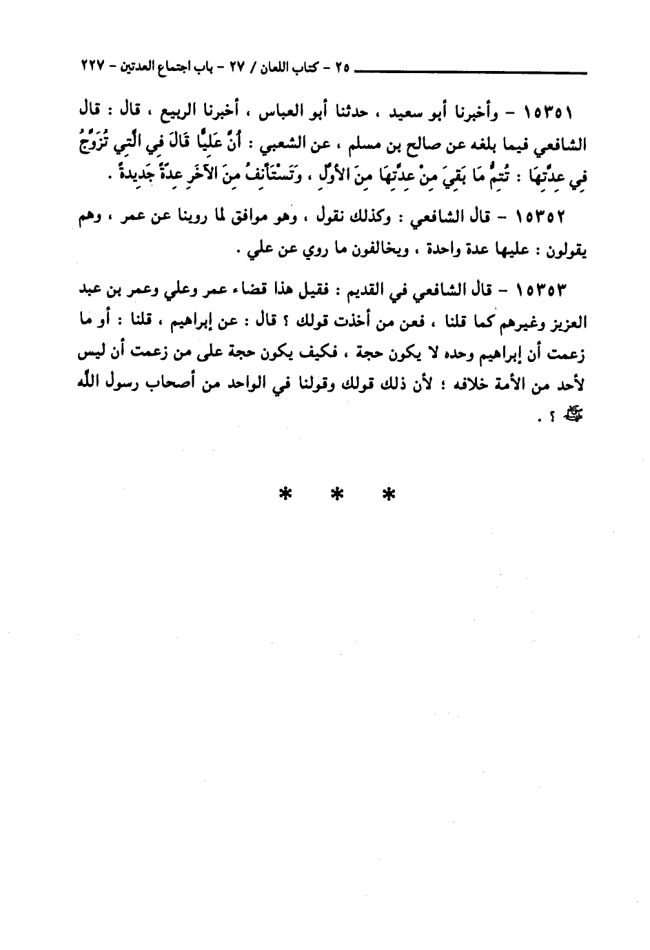15351 - وَأَخْبَرَنَا أَبُو سَعِيدٍ، حَدَّثَنَا أَبُو الْعَبَّاسِ، أَخْبَرَنَا الرَّبِيعُ قَالَ: قَالَ الشَّافِعِيُّ فِيمَا بَلَغَهُ عَنْ صَالِحِ بْنِ مُسْلِمٍ، عَنِ الشَّعْبِيِّ، أَنَّ عَلِيًّا قَالَ فِي الَّتِي تُزَوَّجُ فِي عِدَّتِهَا: «§تُتِمُّ مَا بَقِيَ مِنْ عِدَّتِهَا مِنَ الْأَوَّلِ، وتَسْتَأْنِفُ مِنَ الْآخَرِ عِدَّةً جَدِيدَةً».