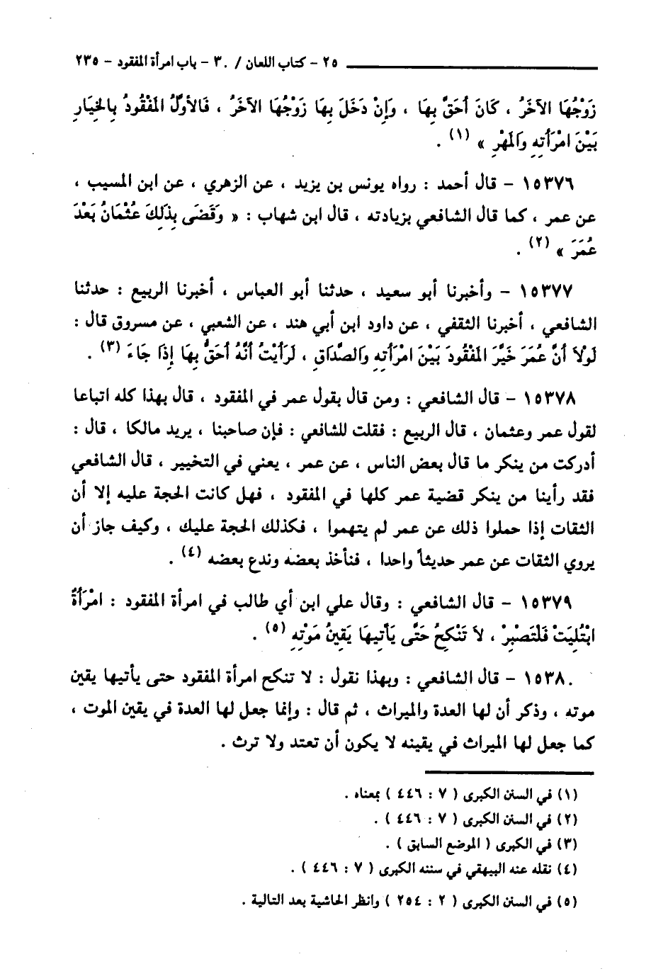 15379 - قَالَ الشَّافِعِيُّ: وَقَالَ عَلِيُّ بْنُ أَبِي طَالِبٍ فِي امْرَأَةِ الْمَفْقُودِ «امْرَأَةٌ ابْتُلِيَتْ فَلْتَصْبِرْ، لَا تَنْكِحُ حَتَّى يَأْتِيَهَا يَقِينُ مَوْتِهِ».