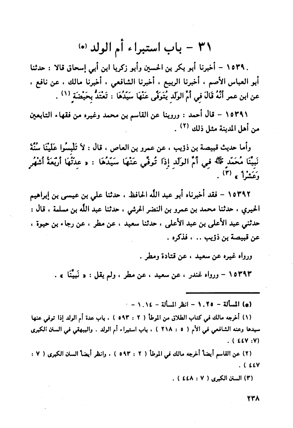 15390 - أَخْبَرَنَا أَبُو بَكْرِ بْنُ الْحُسَيْنِ، وَأَبُو زَكَرِيَّا بْنُ أَبِي إِسْحَاقَ قَالَا: حَدَّثَنَا أَبُو الْعَبَّاسِ الْأَصَمُّ، أَخْبَرَنَا الرَّبِيعُ، أَخْبَرَنَا الشَّافِعِيُّ، أَخْبَرَنَا مَالِكٌ، عَنْ نَافِعٍ، عَنِ ابْنِ عُمَرَ، أَنَّهُ قَالَ فِي أُمِّ الْوَلَدِ يُتَوَفَّى عَنْهَا سَيِّدُهَا: «§تَعْتَدُّ بِحَيْضَةٍ».