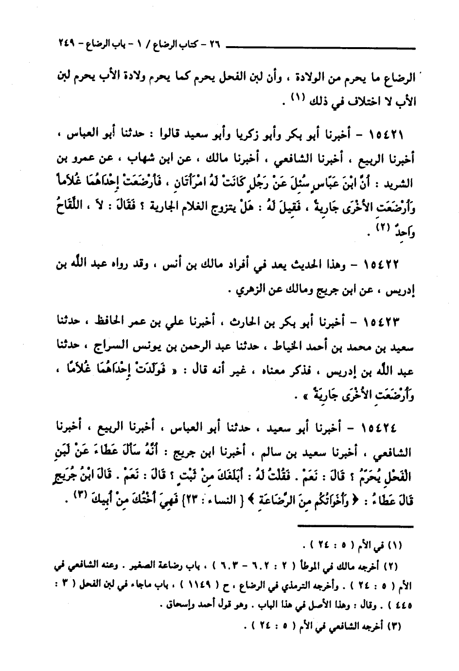 15421 - أَخْبَرَنَا أَبُو بَكْرٍ، وَأَبُو زَكَرِيَّا، وَأَبُو سَعِيدٍ، قَالُوا: حَدَّثَنَا أَبُو الْعَبَّاسِ، أَخْبَرَنَا الرَّبِيعُ، أَخْبَرَنَا الشَّافِعِيُّ، أَخْبَرَنَا مَالِكٌ، عَنِ ابْنِ شِهَابٍ، عَنْ عَمْرِو بْنِ الشَّرِيدِ، أَنَّ ابْنَ عَبَّاسٍ، سُئِلَ عَنْ رَجُلٍ كَانَتْ لَهُ امْرَأَتَانِ، فَأَرْضَعَتْ إِحْدَاهُمَا غُلَامًا، وَأَرْضَعَتِ الْأُخْرَى جَارِيَةً فَقِيلَ لَهُ: هَلْ يَتَزَوَّجُ الْغُلَامُ الْجَارِيَةَ؟ فَقَالَ: «لَا، §» اللِّقَاحُ وَاحِدٌ ".