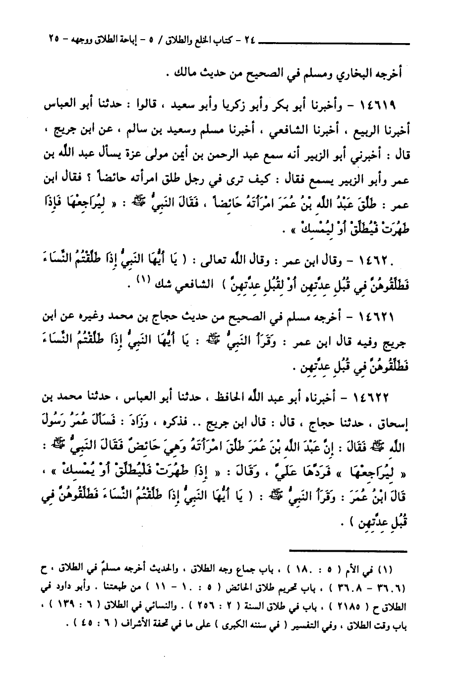 14622 - أَخْبَرَنَاهُ أَبُو عَبْدِ اللَّهِ الْحَافِظُ، حَدَّثَنَا أَبُو الْعَبَّاسِ، حَدَّثَنَا مُحَمَّدُ بْنُ إِسْحَاقَ، حَدَّثَنَا حَجَّاجٌ قَالَ: قَالَ ابْنُ جُرَيْجٍ. . . فَذَكَرَهُ، وَزَادَ: فَسَأَلَ عُمَرُ، رَسُولَ اللَّهِ صَلَّى اللهُ عَلَيْهِ وَسَلَّمَ فَقَالَ: إِنَّ عَبْدَ اللَّهِ بْنَ عُمَرَ طَلَّقَ امْرَأَتَهُ وَهِيَ حَائِضٌ، فَقَالَ النَّبِيُّ صَلَّى اللهُ عَلَيْهِ وَسَلَّمَ: «لِيُرَاجِعْهَا»، فَرَدَّهَا عَلَيَّ وَقَالَ: «إِذَا طَهُرَتْ فَلْيُطَلِّقْ أَوْ يُمْسِكْ» قَالَ ابْنُ عُمَرَ: وَقَرَأَ النَّبِيُّ صَلَّى اللهُ عَلَيْهِ وَسَلَّمَ: (يَا أَيُّهَا النَّبِيُّ إِذَا طَلَّقْتُمُ النِّسَاءَ فَطَلِّقُوهُنَّ فِي قُبُلِ عِدَّتِهِنَّ) -[26]-،