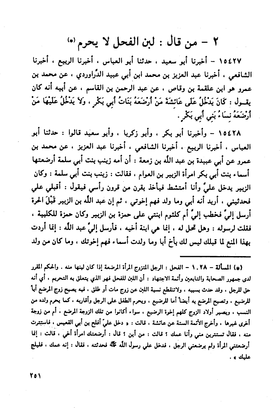 15428 - وَأَخْبَرَنَا أَبُو بَكْرٍ، وَأَبُو زَكَرِيَّا، وَأَبُو سَعِيدٍ، قَالُوا: حَدَّثَنَا أَبُو الْعَبَّاسِ، أَخْبَرَنَا الرَّبِيعُ، أَخْبَرَنَا الشَّافِعِيُّ، أَخْبَرَنَا عَبْدُ الْعَزِيزِ، عَنْ مُحَمَّدِ بْنِ عَمْرٍو، عَنْ أَبِي عُبَيْدَةَ بْنِ عَبْدِ اللَّهِ بْنِ زَمْعَةَ، أَنَّ أُمَّهُ زَيْنَبَ بِنْتَ أَبِي سَلَمَةَ أَرْضَعَتْهَا أَسْمَاءُ بِنْتُ أَبِي بَكْرٍ امْرَأَةُ الزُّبَيْرِ بْنِ الْعَوَّامِ، فَقَالَتْ زَيْنَبُ بِنْتُ أَبِي سَلَمَةَ: وَكَانَ الزُّبَيْرُ يَدْخُلُ عَلَيَّ وَأَنَا أَمْتَشِطُ فَيَأْخُذُ بِقَرْنٍ مِنْ قُرُونِ رَأْسِي فَيَقُولُ: أَقْبِلِي عَلَيَّ فَحَدِّثِينِي، أُرِيدُ أَنَّهُ أَبِي وَمَا وَلَدَ فَهُمْ إِخْوَتِي، ثُمَّ إِنَّ عَبْدَ اللَّهِ بْنَ الزُّبَيْرِ قَبْلَ الْحَرَّةِ أَرْسَلَ إِلَيَّ فَخَطَبَ إِلَيَّ أُمَّ كُلْثُومِ ابْنَتِي عَلَى حَمْزَةَ بْنِ الزُّبَيْرِ، وَكَانَ حَمْزَةُ لَلَكَلْبِيَّةِ، فَقُلْتُ لِرَسُولِهِ: وَهَلْ تَحِلُّ لَهُ، إِنَّمَا هِيَ ابْنَةُ أَخِيهِ، فَأَرْسَلَ إِلَيَّ عَبْدُ اللَّهِ: إِنَّمَا أَرَدْتُ بِهَذَا الْمَنْعَ لِمَا قَبْلَكِ لَيْسَ لَكِ بِأَخٍ أَبًا، وَمَا وَلَدَتْ أَسْمَاءُ فَهُمْ إِخْوَتُكَ، وَمَا كَانَ مِنْ وَلَدِ -[252]- الزُّبَيْرِ مِنْ غَيْرِ الزُّبَيْرِ فَلَيْسُوا لَكِ بِإِخْوَةٍ، فَأَرْسِلِي فَسَلِي عَنْ هَذَا، فَأَرْسَلَتْ فَسَأَلَ، وَأَصْحَابُ رَسُولِ اللَّهِ صَلَّى اللهُ عَلَيْهِ وَسَلَّمَ مُتَوَافِرُونَ وَأُمَّهَاتُ الْمُؤْمِنِينَ فَقَالُوا لَهَا: «إِنَّ §الرَّضَاعَةَ مِنْ قِبَلِ الرِّجَالِ لَا تُحَرِّمُ شَيْئًا، فَأَنْكَحْتُهَا إِيَّاهُ، فَلَمْ تَزَلْ عِنْدَهُ حَتَّى إِذَا هَلَكَ»