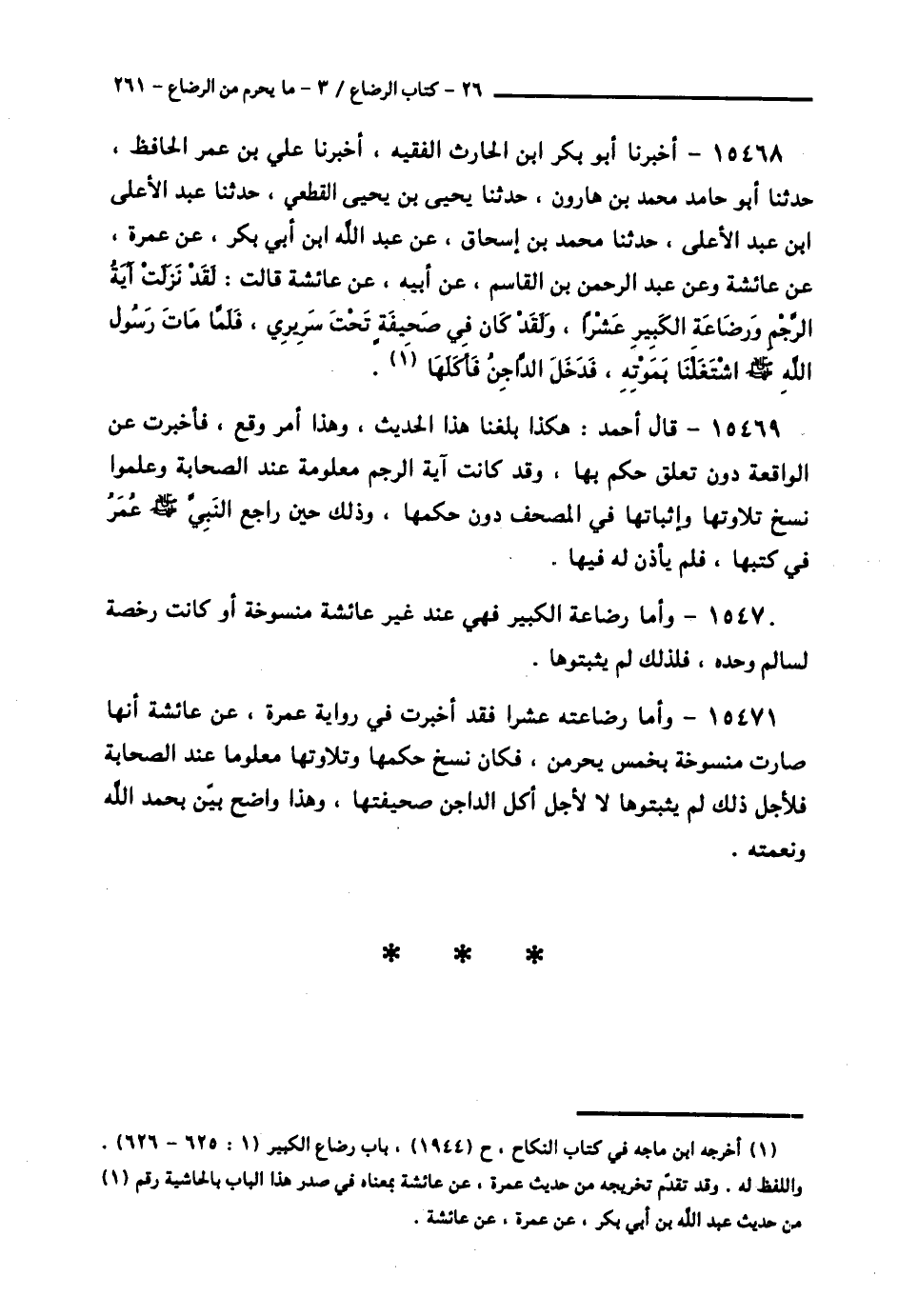 15469 - قَالَ أَحْمَدُ: هَكَذَا بَلَغَنَا هَذَا الْحَدِيثُ، وَهَذَا أَمَرٌ وَقَعَ، فَأَخْبَرَتْ عَنِ الْوَاقِعَةِ دُونَ تَعَلُّقِ حُكْمٍ بِهَا، وَقَدْ كَانَتْ آيَةُ الرَّجْمِ مَعْلُومَةٌ عِنْدَ الصَّحَابَةِ وَعَلِمُوا نَسْخَ تِلَاوَتِهَا وَإِثْبَاتِهَا فِي الْمُصْحَفِ دُونَ حُكْمِهَا، وَذَلِكَ حِينَ رَاجَعَ النَّبِيَّ صَلَّى اللهُ عَلَيْهِ وَسَلَّمَ عُمَرُ فِي كَتْبِهَا، فَلَمْ يَأْذَنْ لَهُ فِيهَا.