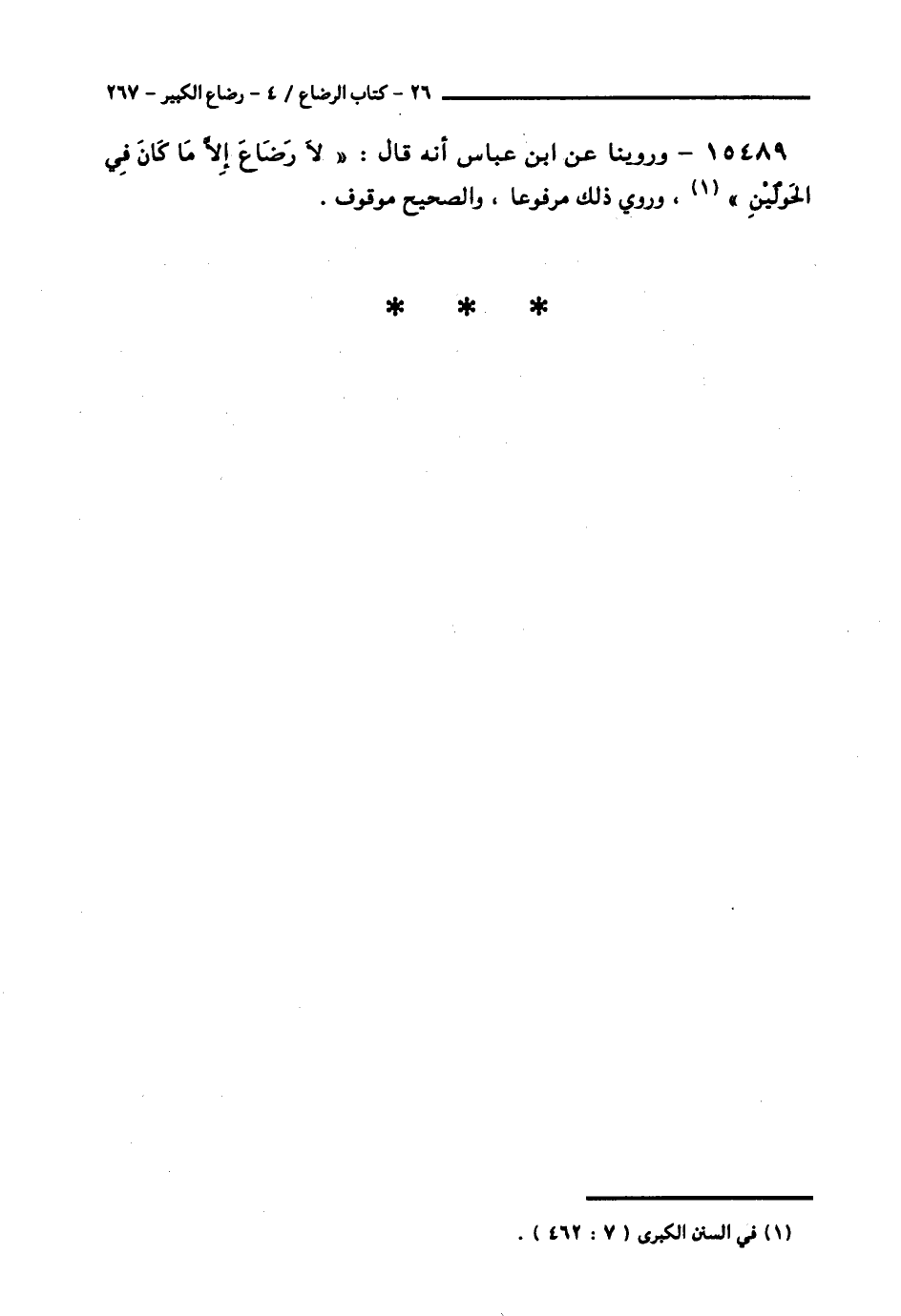 15489 - وَرُوِّينَا عَنِ ابْنِ عَبَّاسٍ، أَنَّهُ قَالَ: § «لَا رَضَاعَ إِلَّا مَا كَانَ فِي الْحَوْلَيْنِ». وَرُوِيَ ذَلِكَ مَرْفُوعًا، وَالصَّحِيحُ مَوْقُوفٌ