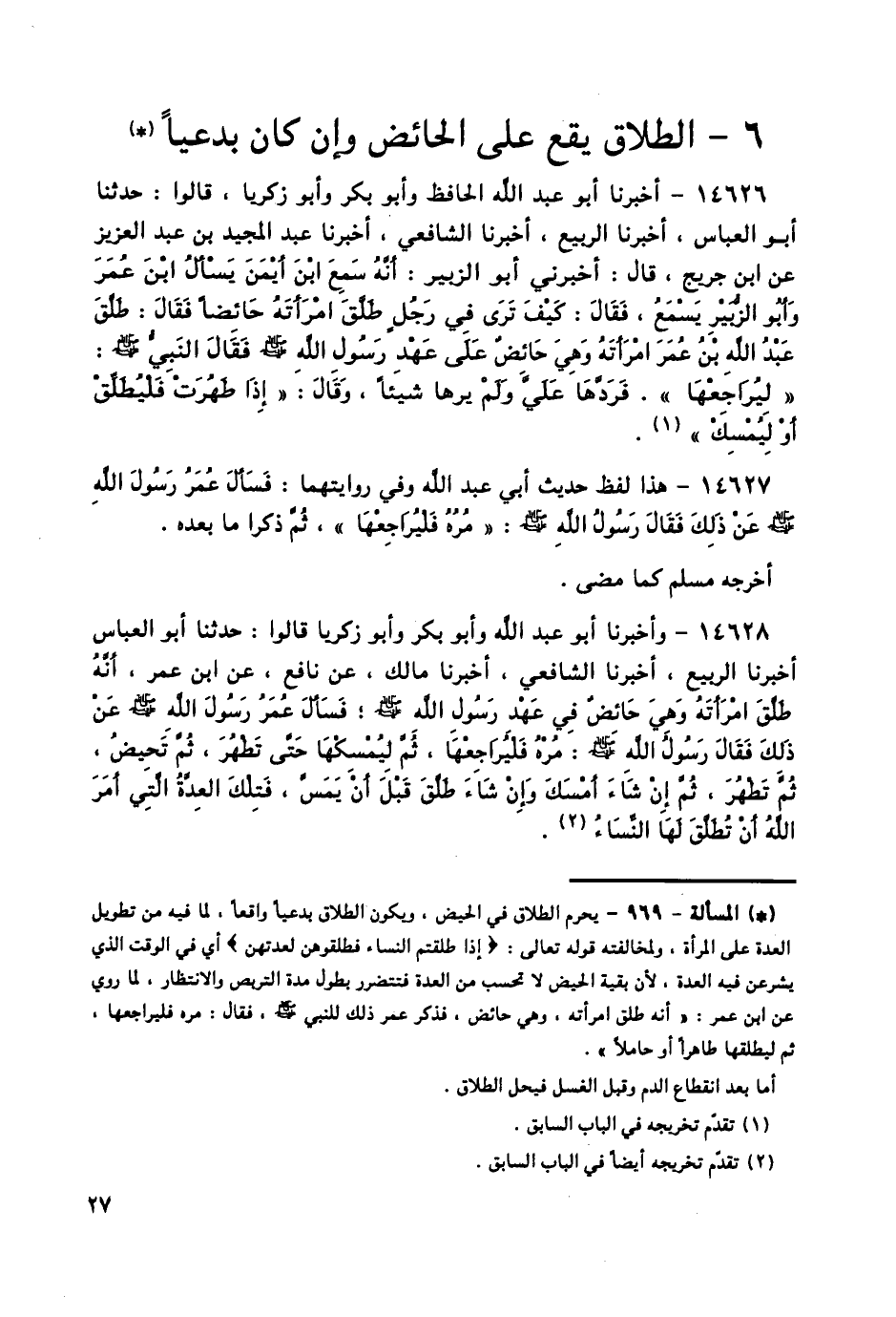 14628 - وَأَخْبَرَنَا أَبُو عَبْدِ اللَّهِ، وَأَبُو بَكْرٍ، وَأَبُو زَكَرِيَّا، قَالُوا: حَدَّثَنَا أَبُو الْعَبَّاسِ، أَخْبَرَنَا الرَّبِيعُ، أَخْبَرَنَا الشَّافِعِيُّ، أَخْبَرَنَا مَالِكٌ، عَنْ نَافِعٍ، عَنِ ابْنِ عُمَرَ، أَنَّهُ طَلَّقَ امْرَأَتَهُ وَهِيَ حَائِضٌ فِي عَهْدِ رَسُولِ اللَّهِ صَلَّى اللهُ عَلَيْهِ وَسَلَّمَ، فَسَأَلَ عُمَرُ رَسُولَ اللَّهِ صَلَّى اللهُ عَلَيْهِ وَسَلَّمَ عَنْ ذَلِكَ، فَقَالَ رَسُولُ اللَّهِ صَلَّى اللهُ عَلَيْهِ وَسَلَّمَ: «§مُرْهُ فَلْيُرَاجِعْهَا، ثُمَّ لِيُمْسِكْهَا حَتَّى تَطْهُرَ، ثُمَّ تَحِيضَ، ثُمَّ تَطْهُرَ، ثُمَّ إِنْ شَاءَ أَمْسَكَ وَإِنْ شَاءَ طَلَّقَ قَبْلَ أَنْ يَمَسَّ، فَتِلْكَ الْعِدَّةُ الَّتِي أَمَرَ اللَّهُ أَنْ تُطَلَّقَ لَهَا النِّسَاءُ» -[28]-. أَخْرَجَاهُ فِي الصَّحِيحِ مِنْ حَدِيثِ مَالِكٍ