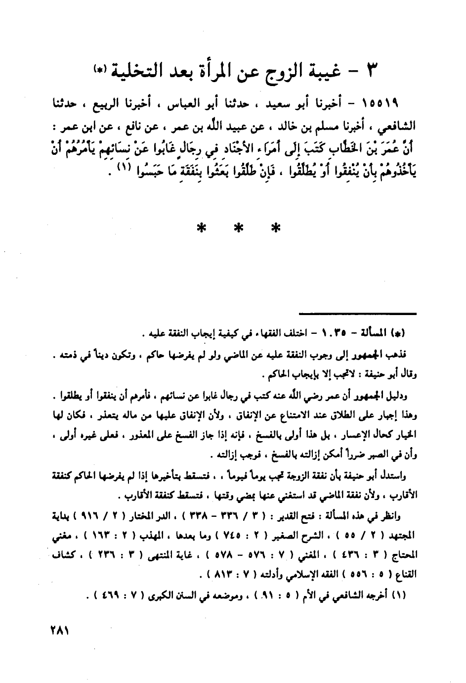 15519 - أَخْبَرَنَا أَبُو سَعِيدٍ، حَدَّثَنَا أَبُو الْعَبَّاسِ، أَخْبَرَنَا الرَّبِيعُ، حَدَّثَنَا الشَّافِعِيُّ، أَخْبَرَنَا مُسْلِمُ بْنُ خَالِدٍ، عَنْ عُبَيْدِ اللَّهِ بْنِ عُمَرَ، عَنْ نَافِعٍ، عَنِ ابْنِ عُمَرَ، أَنَّ عُمَرَ بْنَ الْخَطَّابِ، § «كَتَبَ إِلَى أُمَرَاءِ الْأَجْنَادِ فِي رِجَالٍ غَابُوا عَنْ نِسَائِهِمْ يَأْمُرَهُمْ أَنْ يَأْخُذُوهُمْ بِأَنْ يُنْفِقُوا أَوْ يُطَلِّقُوا، فَإِنْ طَلَّقُوا بَعَثُوا بِنَفَقَةِ مَا حَبَسُوا»