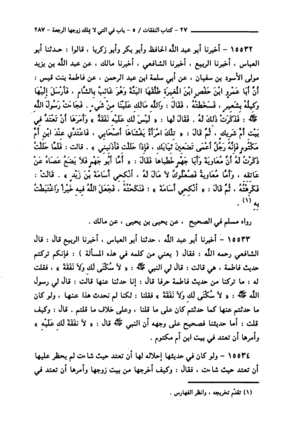 15533 - أَخْبَرَنَا أَبُو عَبْدِ اللَّهِ، حَدَّثَنَا أَبُو الْعَبَّاسِ، أَخْبَرَنَا الرَّبِيعُ قَالَ: قَالَ الشَّافِعِيُّ رَحِمَهُ اللَّهُ: فَقَالَ، يَعْنِي مَنْ كَلَّمَهُ فِي هَذِهِ الْمَسْأَلَةِ، فَإِنَّكُمْ تَرَكْتُمْ حَدِيثَ فَاطِمَةَ، هِيَ قَالَتْ: قَالَ لِي النَّبِيُّ صَلَّى اللهُ عَلَيْهِ وَسَلَّمَ: «لَا سُكْنَى لَكِ وَلَا نَفَقَةَ»، فَقُلْتُ لَهُ: مَا تَرَكْنَا مِنْ حَدِيثِ فَاطِمَةَ حَرْفًا قَالَ: إِنَّا حُدِّثْنَا عَنْهَا قَالَتْ: قَالَ لِي رَسُولُ اللَّهِ صَلَّى اللهُ عَلَيْهِ وَسَلَّمَ: «لَا سُكْنَى لَكِ وَلَا نَفَقَةَ» فَقُلْنَا: لَكِنَّا لَمْ نُحَدَّثْ هَذَا عَنْهَا، وَلَوْ كَانَ مَا حُدِّثْتُمْ عَنْهَا كَمَا حَدَّثْتُمْ كَانَ عَلَى مَا قُلْنَا، وَعَلَى خِلَافِ مَا قُلْتُمْ قَالَ: وَكَيْفَ قُلْتَ؟ أَمَّا حَدِيثُنَا فَصَحِيحٌ عَلَى وَجْهِهِ أَنَّ النَّبِيَّ صَلَّى اللهُ عَلَيْهِ وَسَلَّمَ قَالَ: «لَا نَفَقَةَ لَكِ عَلَيْهِ» وَأَمَرَهَا أَنْ تَعْتَدَّ فِي بَيْتِ ابْنِ أُمِّ مَكْتُومٍ.