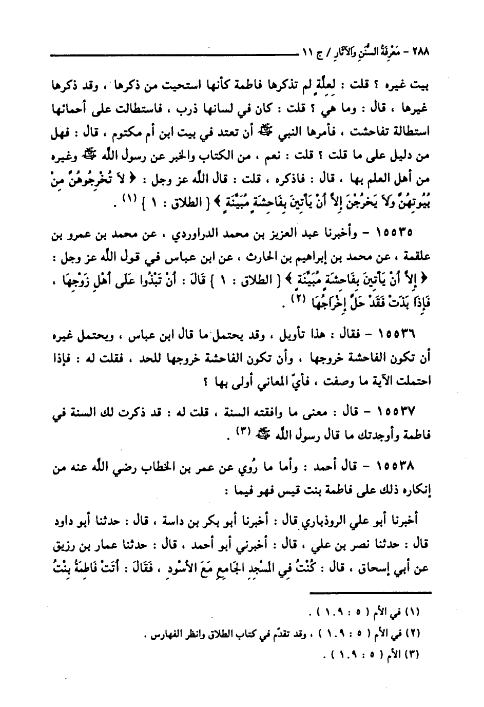 15553 - قَالَ أَحْمَدُ: قَدْ رُوِّينَا فِي حَدِيثِ عُمَرَ أَنَّهُ تَلَا عِنْدَ ذَلِكَ قَوْلَ اللَّهِ عَزَّ وَجَلَّ: {لَا تُخْرِجُوهُنَّ مِنْ بُيُوتِهِنَّ وَلَا يَخْرُجْنَ إِلَّا أَنْ يَأْتِينَ بِفَاحِشَةٍ مُبَيِّنَةٍ} [الطلاق: 1] وَذَلِكَ يُؤَكِّدُ مَا قَالَ الشَّافِعِيُّ