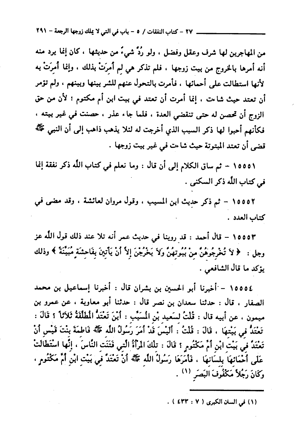 15554 - أَخْبَرَنَا أَبُو الْحُسَيْنِ بْنُ بِشْرَانَ قَالَ: أَخْبَرَنَا إِسْمَاعِيلُ بْنُ مُحَمَّدٍ الصَّفَّارُ قَالَ: حَدَّثَنَا سَعْدَانُ بْنُ نَصْرٍ قَالَ: حَدَّثَنَا أَبُو مُعَاوِيَةَ، عَنْ عَمْرِو بْنِ مَيْمُونٍ، عَنْ أَبِيهِ قَالَ: قُلْتُ لِسَعِيدِ بْنِ الْمُسَيِّبِ: §أَيْنَ تَعْتَدُّ الْمُطَلَّقَةُ ثَلَاثًا؟ قَالَ: «تَعْتَدُّ فِي بَيْتِ زَوْجِهَا» قَالَ: قُلْتُ: أَلَيْسَ قَدْ أَمَرَ رَسُولُ اللَّهِ صَلَّى اللهُ عَلَيْهِ وَسَلَّمَ فَاطِمَةَ بِنْتَ قَيْسٍ أَنْ تَعْتَدَّ فِي بَيْتِ ابْنِ أُمِّ مَكْتُومٍ؟ قَالَ: «تِلْكَ الْمَرْأَةُ الَّتِي فَتَنَتِ النَّاسَ، إِنَّهَا اسْتَطَالَتْ عَلَى أَحْمَائِهَا بِلِسَانِهَا، فَأَمَرَهَا رَسُولُ اللَّهِ صَلَّى اللهُ عَلَيْهِ وَسَلَّمَ أَنْ تَعْتَدَّ فِي بَيْتِ ابْنِ أُمِّ مَكْتُومٍ، وَكَانَ رَجُلًا كَفِيفَ الْبَصَرِ» -[292]-.