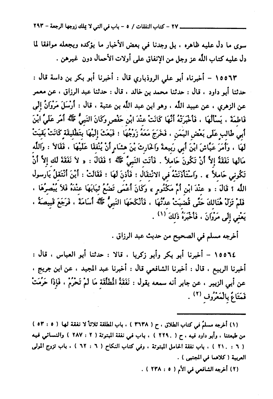 15563 - أَخْبَرَنَاهُ أَبُو عَلِيٍّ الرُّوذْبَارِيُّ قَالَ: أَخْبَرَنَا أَبُو بَكْرِ بْنُ دَاسَةَ قَالَ: حَدَّثَنَا أَبُو دَاوُدَ قَالَ: حَدَّثَنَا مُحَمَّدُ بْنُ خَالِدٍ قَالَ: حَدَّثَنَا عَبْدُ الرَّزَّاقِ، عَنْ مَعْمَرٍ، عَنِ الزُّهْرِيِّ، عَنْ عُبَيْدِ اللَّهِ وَهُوَ ابْنُ عَبْدِ اللَّهِ بْنِ عُتْبَةَ قَالَ: أَرْسَلَ مَرْوَانُ إِلَى فَاطِمَةَ يَسْأَلُهَا، فَأَخْبَرَتْهُ أَنَّهَا كَانَتْ عِنْدَ ابْنِ حَفْصٍ وَكَانَ النَّبِيُّ صَلَّى اللهُ عَلَيْهِ وَسَلَّمَ أَمَرَ عَلِيَّ بْنَ أَبِي طَالِبِ عَلَى بَعْضِ الْيَمَنِ، فَخَرَجَ مَعَهُ زَوْجُهَا، فَبَعَثَ إِلَيْهَا بِتَطْلِيقَةٍ كَانَتْ بَقِيَتْ لَهَا، وَأَمَرَ عَيَّاشَ بْنَ أَبِي رَبِيعَةَ، وَالْحَارِثَ بْنَ هِشَامٍ أَنْ يُنْفِقَا عَلَيْهَا، فَقَالَا: وَاللَّهِ مَا لَهَا نَفَقَةٌ إِلَّا أَنْ تَكُونَ حَامِلًا، فَأَتَتِ النَّبِيَّ صَلَّى اللهُ عَلَيْهِ وَسَلَّمَ فَقَالَ: § «لَا نَفَقَةَ لَكِ إِلَّا أَنْ تَكُونِيَ حَامِلًا». وَاسْتَأْذَنَتْهُ فِي الِانْتِقَالِ، فَأَذِنَ لَهَا، فَقَالَتْ: أَيْنَ انْتَقِلُ يَا رَسُولَ اللَّهِ؟ قَالَ: «عِنْدَ ابْنِ أُمِّ مَكْتُومٍ» وَكَانَ أَعْمَى تَضَعُ ثِيَابَهَا عِنْدَهُ فَلَا يُبْصِرُهَا، فَلَمْ تَزَلْ هُنَالِكَ حَتَّى قُضِيَتْ عِدَّتُهَا، فَأَنْكَحَهَا النَّبِيُّ صَلَّى اللهُ عَلَيْهِ وَسَلَّمَ أُسَامَةَ، فَرَجَعَ قَبِيصَةُ، يَعْنِي إِلَى مَرْوَانَ، فَأَخْبَرَهُ ذَلِكَ. أَخْرَجَهُ مُسْلِمٌ فِي الصَّحِيحِ، مِنْ حَدِيثِ عَبْدِ الرَّزَّاقِ