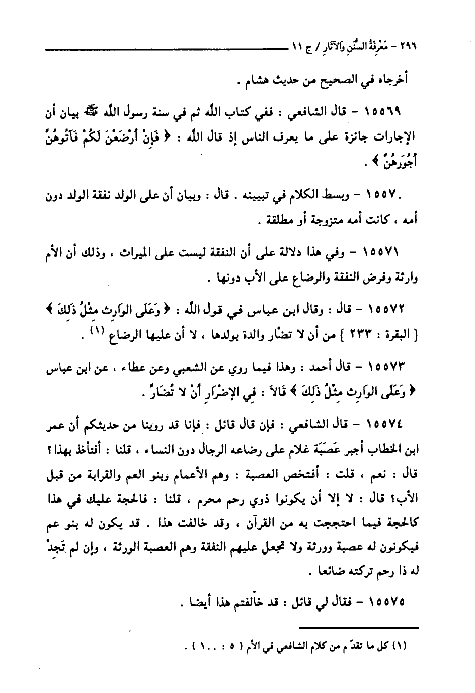 15574 - قَالَ الشَّافِعِيُّ: " فَإِنْ قَالَ قَائِلٌ: فَإِنَّا قَدْ رُوِّينَا مِنْ حَدِيثِكُمْ أَنَّ عُمَرَ بْنَ الْخَطَّابِ أَجْبَرَ عَصَبَةَ غُلَامٍ عَلَى رَضَاعَةِ الرِّجَالِ دُونَ النِّسَاءِ، قُلْنَا: أَفَتَأْخُذُ بِهَذَا؟ قَالَ: نَعَمْ، قُلْتُ: أَفَتَخُصُّ الْعَصَبَةَ: وَهُمُ الْأَعْمَامُ وَبَنُو الْعَمِّ وَالْقَرَابَةُ مِنْ قِبَلِ الْأَبِ؟ قَالَ: لَا إِلَّا أَنْ يَكُونُوا ذَوِي رَحِمٍ مُحَرَّمٍ، قُلْنَا: فَالْحُجَّةُ عَلَيْكَ فِي هَذَا كَالْحُجَّةِ فِيمَا احْتَجَجْتَ بِهِ مِنَ الْقُرْآنِ، وَقَدْ خَالَفْتَ هَذَا، قَدْ يَكُونُ لَهُ بَنُو عَمٍّ فَيَكُونُونَ لَهُ عَصَبَةٌ وَوَرَثَةٌ وَلَا تَجْعَلْ عَلَيْهِمُ النَّفَقَةَ وَهُمُ الْعَصَبَةُ الْوَرَثَةُ، وَإِنْ لَمْ تَجِدْ لَهُ ذَا رَحِمٍ تَرَكْتَهُ ضَائِعًا.