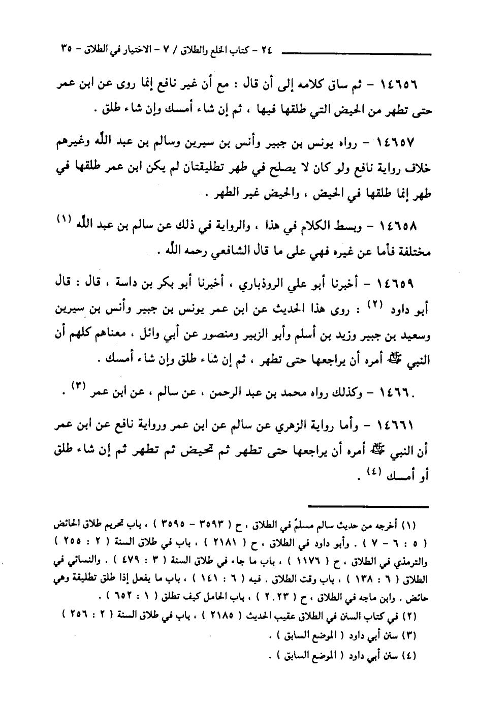14659 - أَخْبَرَنَا أَبُو عَلِيٍّ الرُّوذْبَارِيُّ، أَخْبَرَنَا أَبُو بَكْرِ بْنُ دَاسَةَ قَالَ: قَالَ أَبُو دَاوُدَ: رَوَى هَذَا الْحَدِيثَ، عَنِ ابْنِ عُمَرَ، يُونُسُ بْنُ جُبَيْرٍ، وَأَنَسُ بْنُ سِيرِينَ، وَسَعِيدُ بْنُ جُبَيْرٍ، وَزَيْدُ بْنُ أَسْلَمَ، وَأَبُو الزُّبَيْرِ، وَمَنْصُورٌ، عَنْ أَبِي وَائِلٍ، مَعْنَاهُمْ كُلُّهُمْ «أَنَّ النَّبِيَّ صَلَّى اللهُ عَلَيْهِ وَسَلَّمَ» §أَمَرَهُ أَنْ يُرَاجِعَهَا حَتَّى تَطْهُرَ، ثُمَّ إِنَّ شَاءَ طَلَّقَ وَإِنْ شَاءَ أَمْسَكَ «.