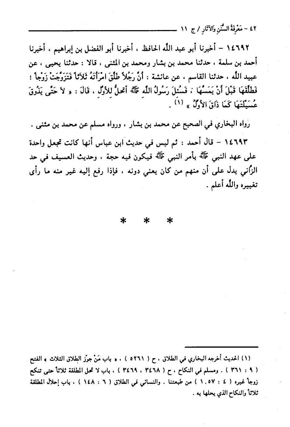 14692 - أَخْبَرَنَا أَبُو عَبْدِ اللَّهِ الْحَافِظُ، أَخْبَرَنَا أَبُو الْفَضْلِ بْنُ إِبْرَاهِيمَ، أَخْبَرَنَا أَحْمَدُ بْنُ سَلَمَةَ، حَدَّثَنَا مُحَمَّدُ بْنُ بَشَّارٍ، وَمُحَمَّدُ بْنُ الْمُثَنَّى قَالَا: حَدَّثَنَا يَحْيَى، عَنْ عُبَيْدِ اللَّهِ، حَدَّثَنَا الْقَاسِمُ، عَنْ عَائِشَةَ، أَنَّ رَجُلًا طَلَّقَ امْرَأَتَهُ ثَلَاثًا فَتَزَوَّجَتْ زَوْجًا، فَطَلَّقَهَا قَبْلَ أَنْ يَمَسَّهَا، فَسُئِلَ رَسُولُ اللَّهِ صَلَّى اللهُ عَلَيْهِ وَسَلَّمَ أَتَحِلُّ لِلْأَوَّلِ؟ قَالَ: § «لَا حَتَّى يَذُوقَ عُسَيْلَتَهَا كَمَا ذَاقَ الْأَوَّلُ». رَوَاهُ الْبُخَارِيُّ فِي الصَّحِيحِ، عَنْ مُحَمَّدِ بْنِ بَشَّارٍ، وَرَوَاهُ مُسْلِمٌ، عَنْ مُحَمَّدِ بْنِ مُثَنًّى.