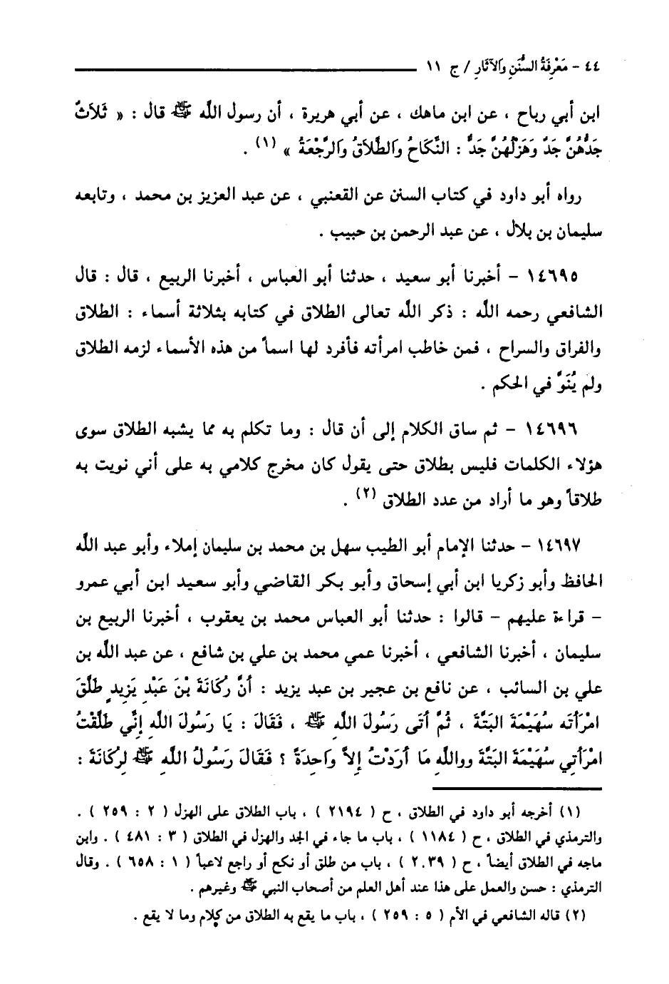 14697 - حَدَّثَنَا الْإِمَامُ أَبُو الطَّيِّبِ سَهْلُ بْنُ مُحَمَّدِ بْنِ سُلَيْمَانَ، إِمْلَاءً، وَأَبُو عَبْدِ اللَّهِ الْحَافِظُ، وَأَبُو زَكَرِيَّا بْنُ أَبِي إِسْحَاقَ، وَأَبُو بَكْرٍ الْقَاضِي، وَأَبُو سَعِيدِ بْنُ أَبِي عَمْرٍو، قِرَاءَةً عَلَيْهِمْ قَالُوا: حَدَّثَنَا أَبُو الْعَبَّاسِ مُحَمَّدُ بْنُ يَعْقُوبَ، أَخْبَرَنَا الرَّبِيعُ بْنُ سُلَيْمَانَ، أَخْبَرَنَا الشَّافِعِيُّ، أَخْبَرَنَا عَمِّي مُحَمَّدُ بْنُ عَلِيِّ بْنِ شَافِعٍ، عَنْ عَبْدِ اللَّهِ بْنِ عَلِيِّ بْنِ السَّائِبِ، عَنْ نَافِعِ بْنِ عُجَيْرِ بْنِ عَبْدِ يَزِيدَ، أَنَّ رُكَانَةَ بْنَ عَبْدِ يَزِيدَ طَلَّقَ امْرَأَتَهُ سُهَيْمَةَ الْبَتَّةَ، ثُمَّ أَتَى رَسُولَ اللَّهِ صَلَّى اللهُ عَلَيْهِ وَسَلَّمَ فَقَالَ: يَا رَسُولَ اللَّهِ إِنِّي طَلَّقْتُ امْرَأَتِي سُهَيْمَةَ الْبَتَّةَ وَوَاللَّهِ مَا أَرَدْتُ إِلَّا وَاحِدَةً؟ فَقَالَ رَسُولُ اللَّهِ صَلَّى اللهُ عَلَيْهِ وَسَلَّمَ لِرُكَانَةَ -[45]-: «وَاللَّهِ» §مَا أَرَدْتَ إِلَّا وَاحِدَةً؟ "، فَقَالَ: رُكَانَةَ: وَاللَّهِ مَا أَرَدْتُ إِلَّا وَاحِدَةً، فَرَدَّهَا إِلَيْهِ رَسُولُ اللَّهِ صَلَّى اللهُ عَلَيْهِ وَسَلَّمَ، فَطَلَّقَهَا الثَّانِيَةَ فِي زَمَانِ عُمَرَ، وَالثَّالِثَةَ فِي زَمَانِ عُثْمَانَ.