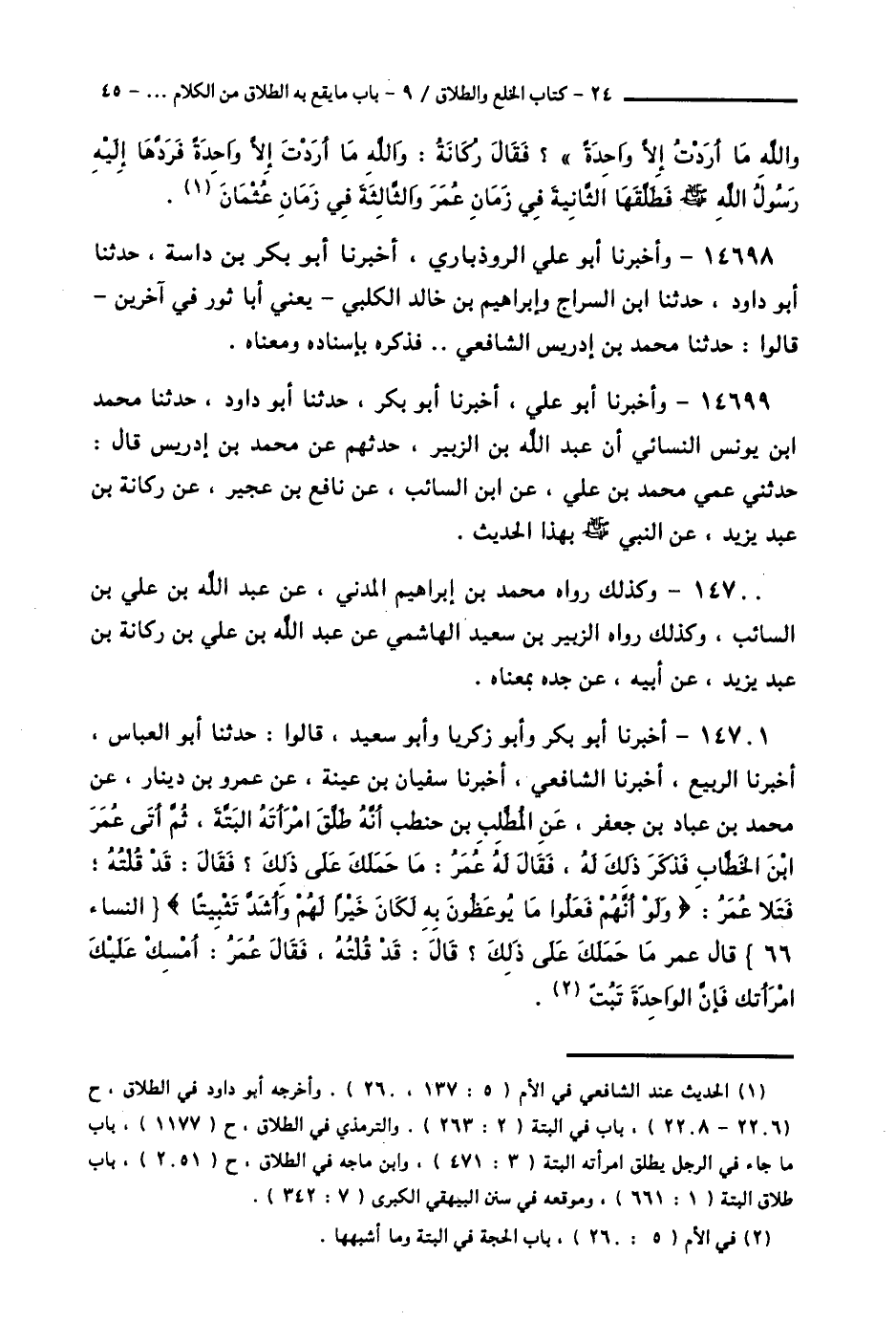 14701 - أَخْبَرَنَا أَبُو بَكْرٍ، وَأَبُو زَكَرِيَّا، وَأَبُو سَعِيدٍ، قَالُوا: حَدَّثَنَا أَبُو الْعَبَّاسِ، أَخْبَرَنَا الرَّبِيعُ، أَخْبَرَنَا الشَّافِعِيُّ، أَخْبَرَنَا سُفْيَانُ بْنُ عُيَيْنَةَ، عَنْ عَمْرِو بْنِ دِينَارٍ، عَنْ مُحَمَّدِ بْنِ عَبَّادِ بْنِ جَعْفَرٍ، عَنِ الْمُطَّلِبِ بْنِ حَنْطَبٍ، أَنَّهُ طَلَّقَ امْرَأَتَهُ الْبَتَّةَ، ثُمَّ أَتَى عُمَرَ بْنَ الْخَطَّابِ فَذَكَرَ ذَلِكَ لَهُ، فَقَالَ لَهُ عُمَرُ: «مَا حَمَلَكَ عَلَى ذَلِكَ؟»، فَقَالَ: قَدْ قُلْتُهُ، فَتَلَا عُمَرُ: {وَلَوْ أَنَّهُمْ فَعَلُوا مَا يُوعَظُونَ بِهِ لَكَانَ خَيْرًا لَهُمْ وَأَشَدَّ تَثْبِيتًا} [النساء: 66] قَالَ عُمَرُ: «مَا حَمَلَكَ عَلَى ذَلِكَ؟» قَالَ: قَدْ قُلْتُهُ، فَقَالَ عُمَرُ: § «أَمْسِكْ عَلَيْكَ امْرَأَتَكَ فَإِنَّ الْوَاحِدَةَ تَبُتُّ» -[46]-.