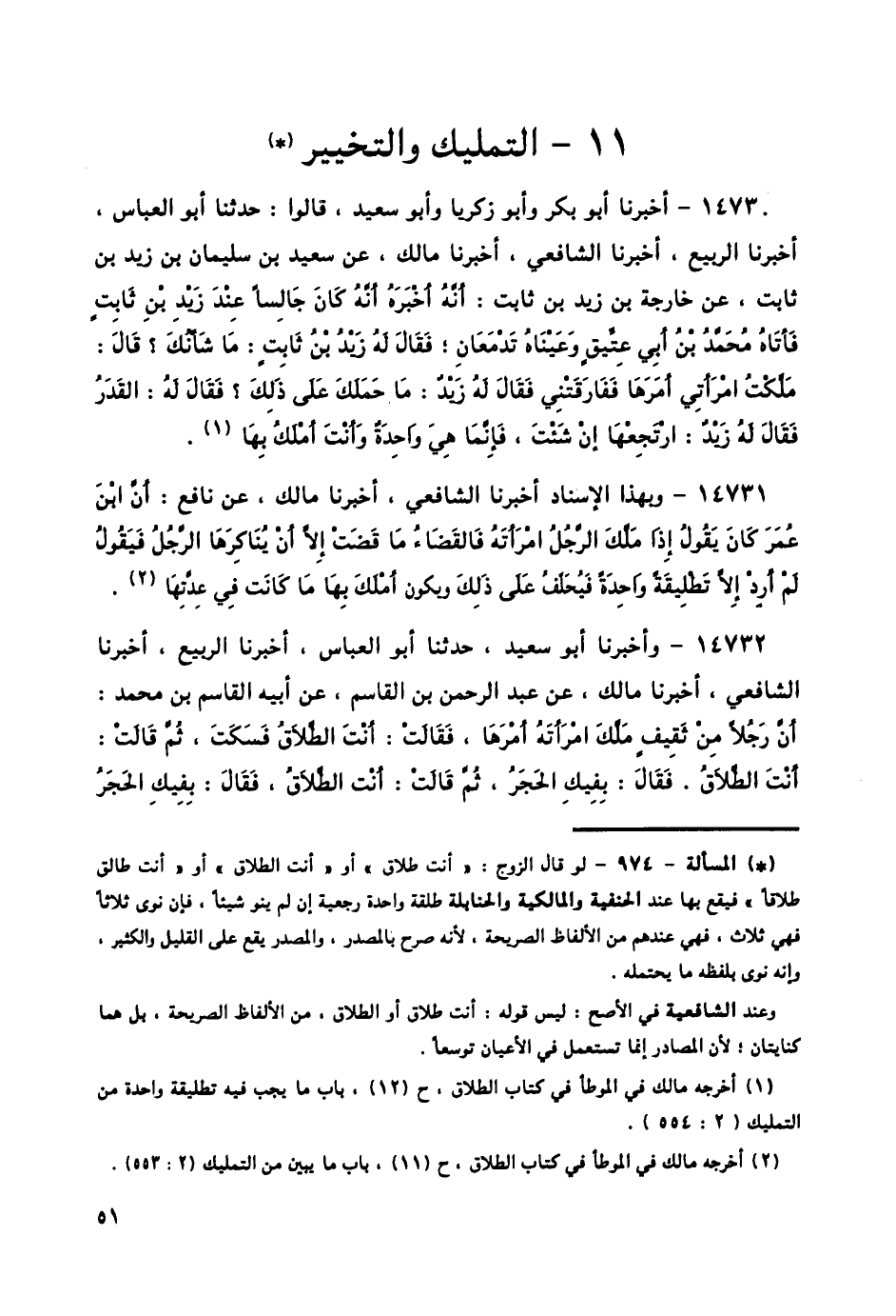14730 - أَخْبَرَنَا أَبُو بَكْرٍ، وَأَبُو زَكَرِيَّا، وَأَبُو سَعِيدٍ، قَالُوا: حَدَّثَنَا أَبُو الْعَبَّاسِ، أَخْبَرَنَا الرَّبِيعُ، أَخْبَرَنَا الشَّافِعِيُّ، أَخْبَرَنَا مَالِكٌ، عَنْ سَعِيدِ بْنِ سُلَيْمَانَ بْنِ زَيْدِ بْنِ ثَابِتٍ، عَنْ خَارِجَةَ بْنِ زَيْدِ بْنِ ثَابِتٍ أَنَّهُ أَخْبَرَهُ، أَنَّهُ كَانَ جَالِسًا عِنْدَ زَيْدِ بْنِ ثَابِتٍ، فَأَتَاهُ مُحَمَّدُ بْنُ أَبِي عَتِيقٍ وَعَيْنَاهُ تَدْمَعَانِ، فَقَالَ لَهُ زَيْدُ بْنُ ثَابِتٍ: «مَا شَأْنُكَ؟» قَالَ: مَلَّكْتُ امْرَأَتِي أَمْرَهَا فَفَارَقَتْنِي، فَقَالَ لَهُ زَيْدٌ: «مَا حَمَلَكَ عَلَى ذَلِكَ؟»، فَقَالَ لَهُ: الْقَدَرُ، فَقَالَ لَهُ زَيْدٌ: «§ارْتَجِعْهَا إِنْ شِئْتَ، فَإِنَّمَا هِيَ وَاحِدَةٌ وَأَنْتَ أَمْلَكُ بِهَا»