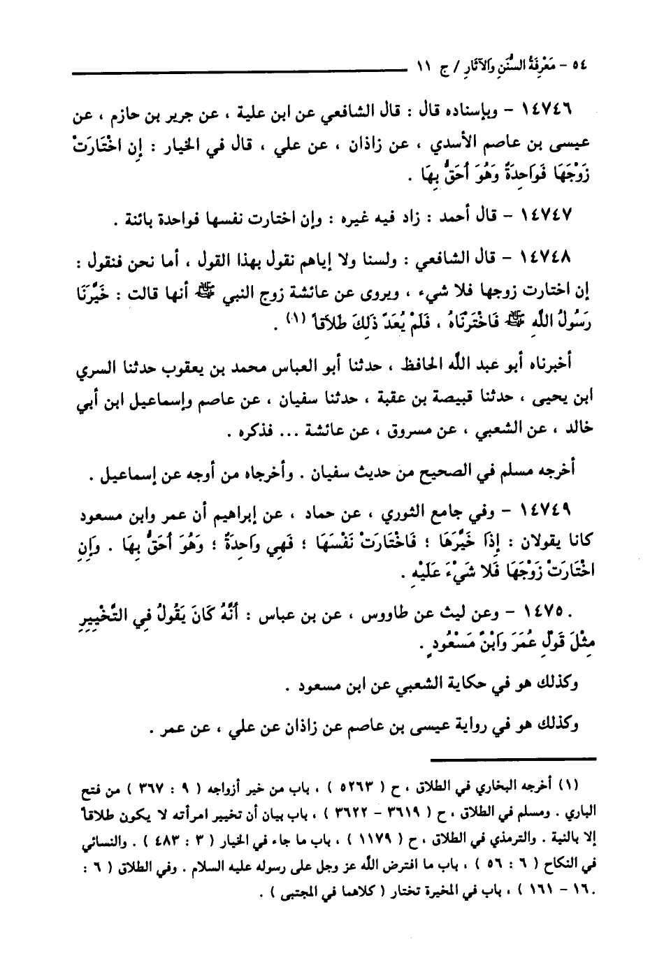 14748 - قَالَ الشَّافِعِيُّ: وَلَسْنَا وَلَا إِيَّاهُمْ نَقُولُ بِهَذَا الْقَوْلِ، أَمَّا نَحْنُ فَنَقُولُ: إِنِ اخْتَارَتْ زَوْجَهَا فَلَا شَيْءَ، وَيُرْوَى عَنْ عَائِشَةَ زَوْجِ النَّبِيِّ صَلَّى اللهُ عَلَيْهِ وَسَلَّمَ، أَنَّهَا قَالَتْ: «§خَيَّرَنَا رَسُولُ اللَّهِ صَلَّى اللهُ عَلَيْهِ وَسَلَّمَ فَاخْتَرْنَاهُ، فَلَمْ يَعُدَّ ذَلِكَ طَلَاقًا». أَخْبَرَنَاهُ أَبُو عَبْدِ اللَّهِ الْحَافِظُ، حَدَّثَنَا أَبُو الْعَبَّاسِ مُحَمَّدُ بْنُ يَعْقُوبَ، حَدَّثَنَا السَّرِيُّ بْنُ يَحْيَى، حَدَّثَنَا قَبِيصَةُ بْنُ عُقْبَةَ، حَدَّثَنَا سُفْيَانُ، عَنْ عَاصِمٍ، وَإِسْمَاعِيلَ بْنِ أَبِي خَالِدٍ، عَنِ الشَّعْبِيِّ، عَنْ مَسْرُوقٍ، عَنْ عَائِشَةَ فَذَكَرَهُ. أَخْرَجَهُ مُسْلِمٌ فِي الصَّحِيحِ مِنْ حَدِيثِ سُفْيَانَ. وَأَخْرَجَاهُ مِنْ أَوْجُهٍ، عَنْ إِسْمَاعِيلَ.