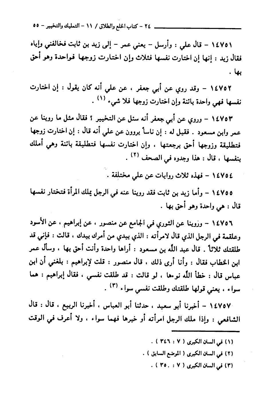 14751 - قَالَ عَلِيٌّ: وَأَرْسَلَ، يَعْنِي عُمَرَ، إِلَى زَيْدِ بْنِ ثَابِتٍ فَخَالَفَنِي وَإِيَّاهُ، فَقَالَ زَيْدٌ: «§إِنَّهَا إِنِ اخْتَارَتْ نَفْسَهَا فَثَلَاثٌ وَإِنِ اخْتَارَتْ زَوْجَهَا فَوَاحِدَةٌ وَهُوَ أَحَقُّ بِهَا»