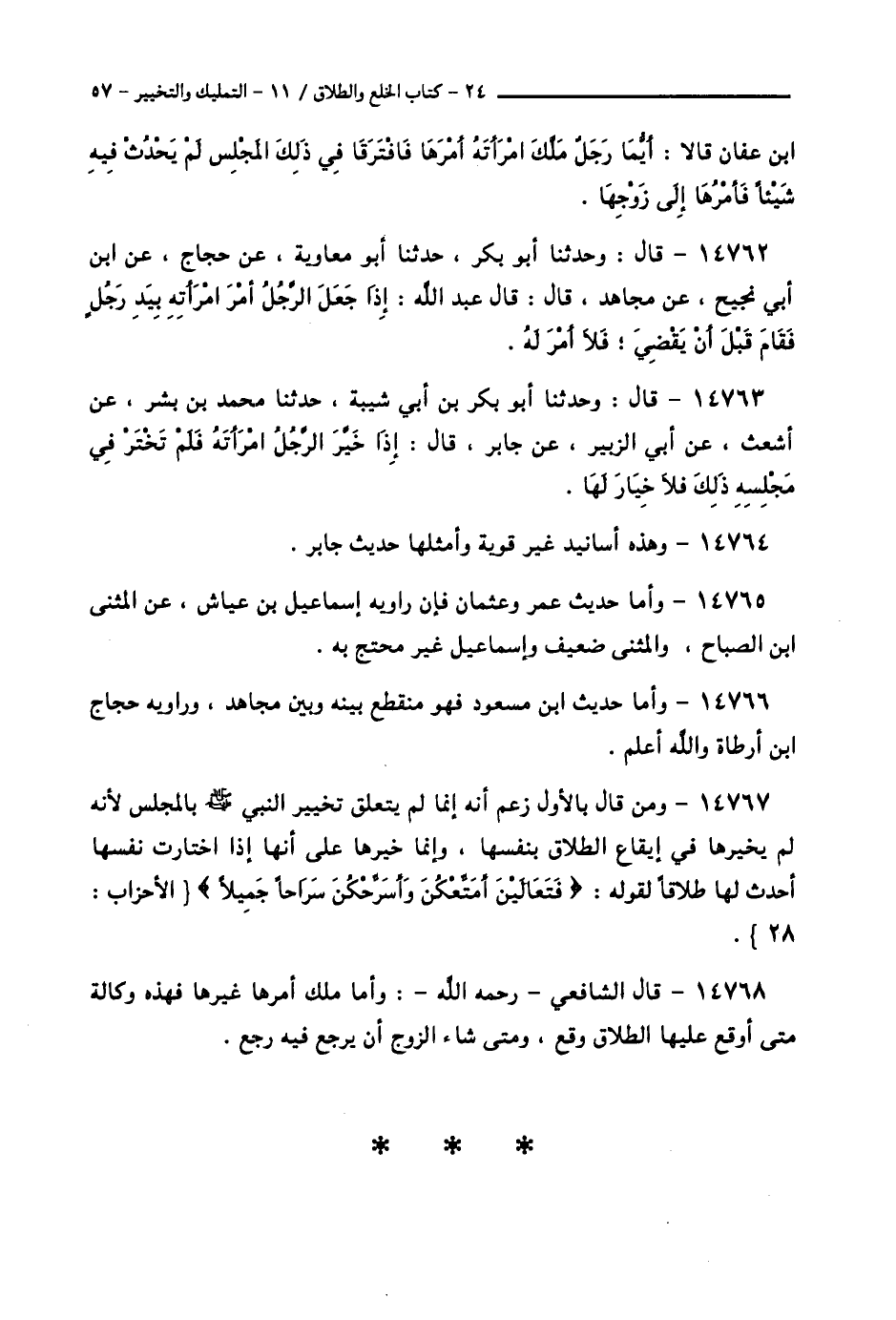 14763 - قَالَ: وَحَدَّثَنَا أَبُو بَكْرِ بْنُ أَبِي شَيْبَةَ، حَدَّثَنَا مُحَمَّدُ بْنُ بِشْرٍ، عَنْ أَشْعَثَ، عَنْ أَبِي الزُّبَيْرِ، عَنْ جَابِرٍ قَالَ: § «إِذَا خَيَّرَ الرَّجُلُ امْرَأَتَهُ فَلَمْ تَخْتَرْ فِي مَجْلِسِهِ ذَلِكَ فَلَا خِيَارَ لَهَا».
